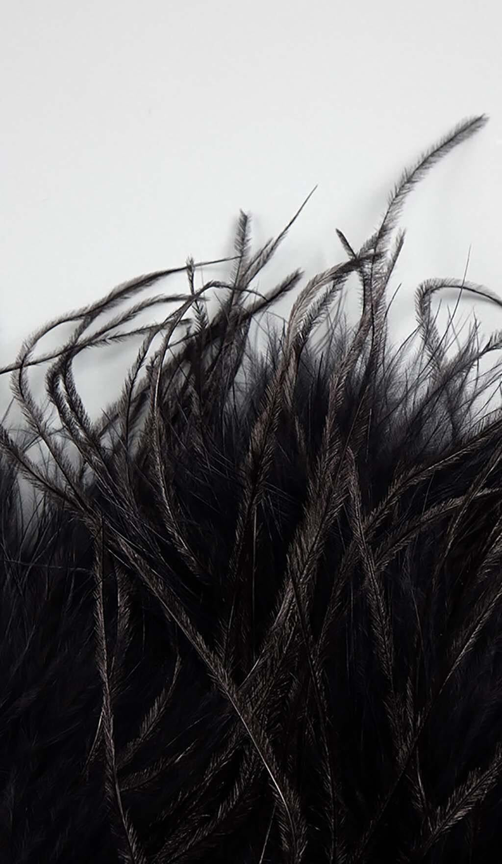 The cold-shoulder silhouette of this dress is both alluring and sophisticated, allowing you to show off some skin while still maintaining an elegant and demure look. The feathers beautifully fringe the arms, neckline, and hem, creating a dramatic and ultra-glamorous finish.