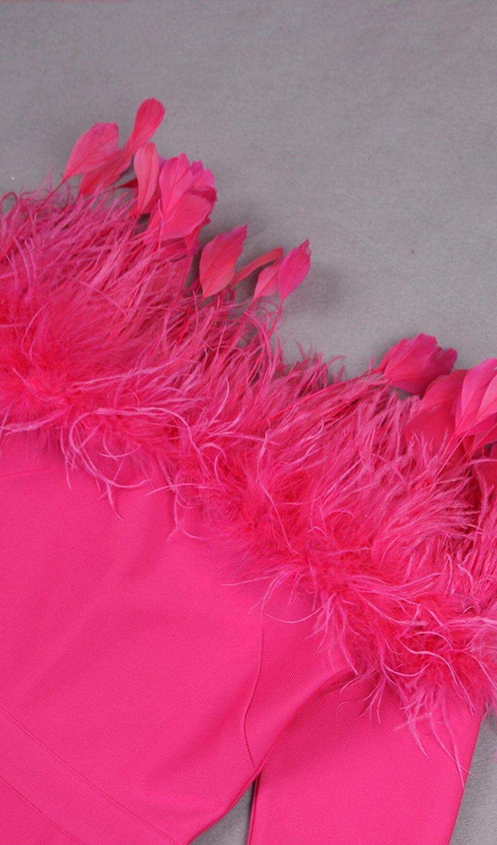 Elevate your style with our Feather Trim Midi Dress in Crimson. This dress is designed to make you feel glamorous and confident for any occasion. With its exquisite bodycon silhouette, daring plunge neckline, and intricate feather trim, this dress is a true showstopper.