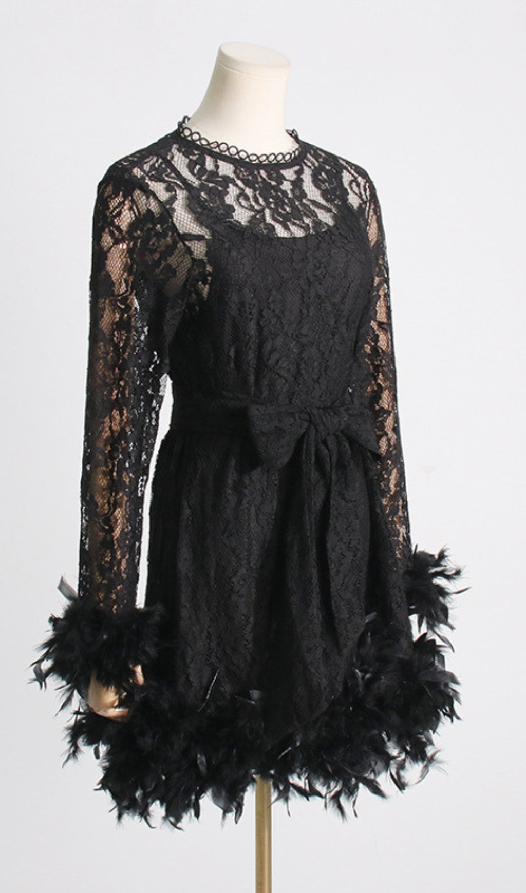 Experience elegance and sophistication with our Feather Trimmed Lace Dress. Made with delicate lace and adorned with luxurious feathers, this dress exudes timeless beauty. Perfect for special occasions, the dress will make you feel confident and glamorous. A must-have in your wardrobe.