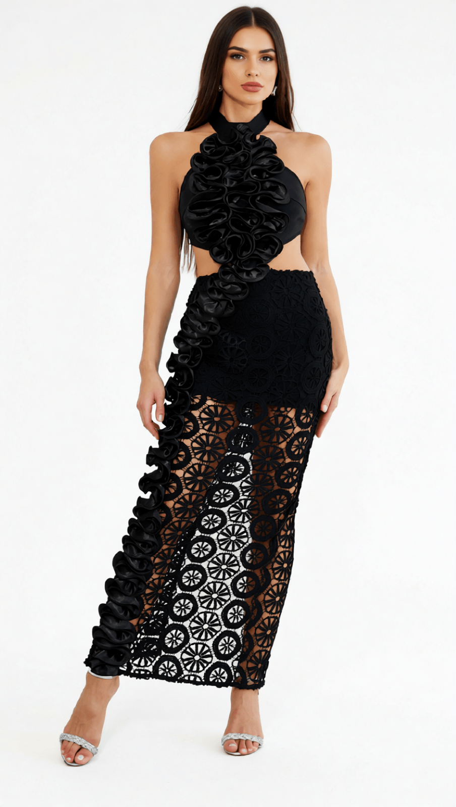 GLAMOROUS BLACK HALTERNECK RUFFLED CUTOUT LACE MAXI DRESS - ELEGANT EVENING GOWN