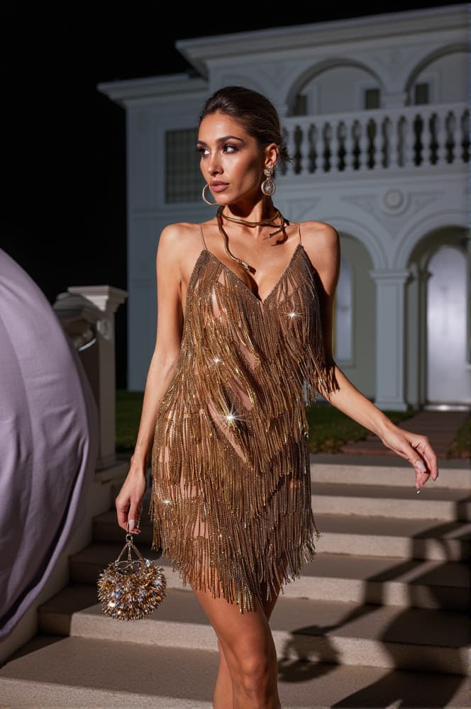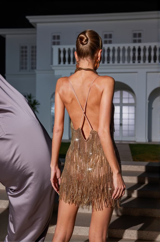 Fiadh Crystal Chain Fringe Mesh Mini Dress In Gold