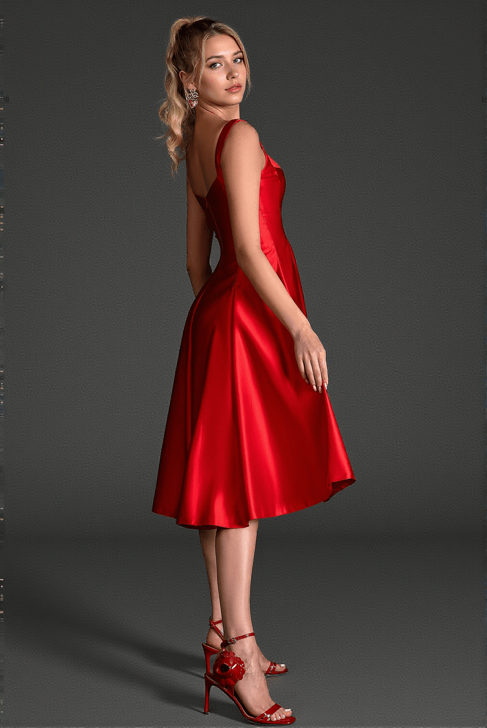 Filio Strap Satin Patchwork Dress In Red - Model Wearing Size M This revised description provides detailed information about the product while maintaining SEO best practices for both Google and Pinterest. The use of multiple headings and lists helps to break up the text and makes it more readable, encouraging potential customers to engage with the content and consider making a purchase.