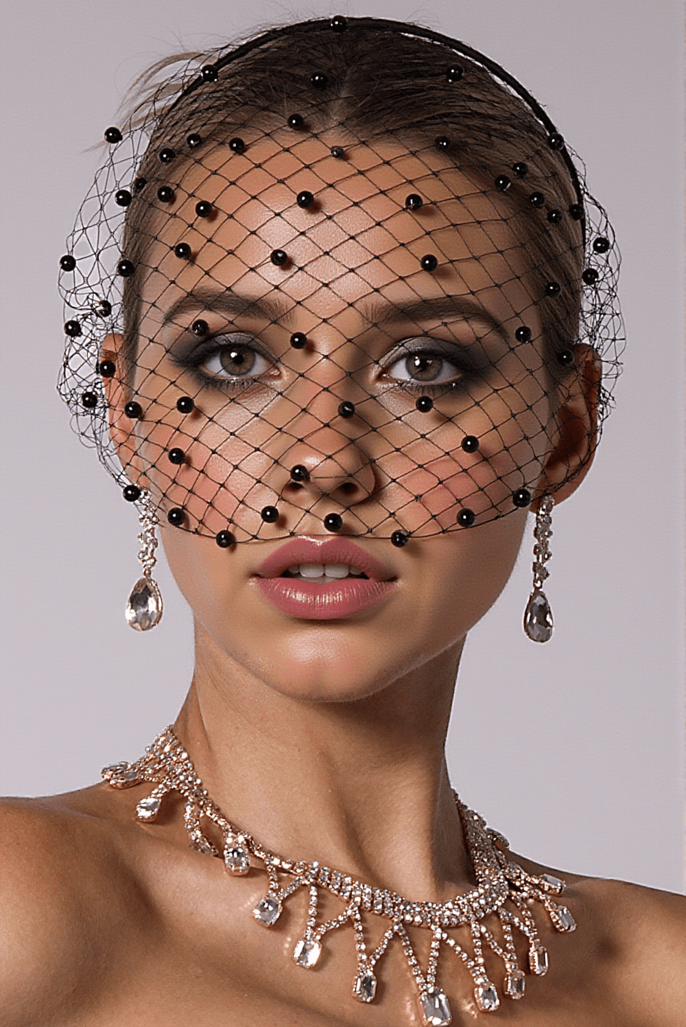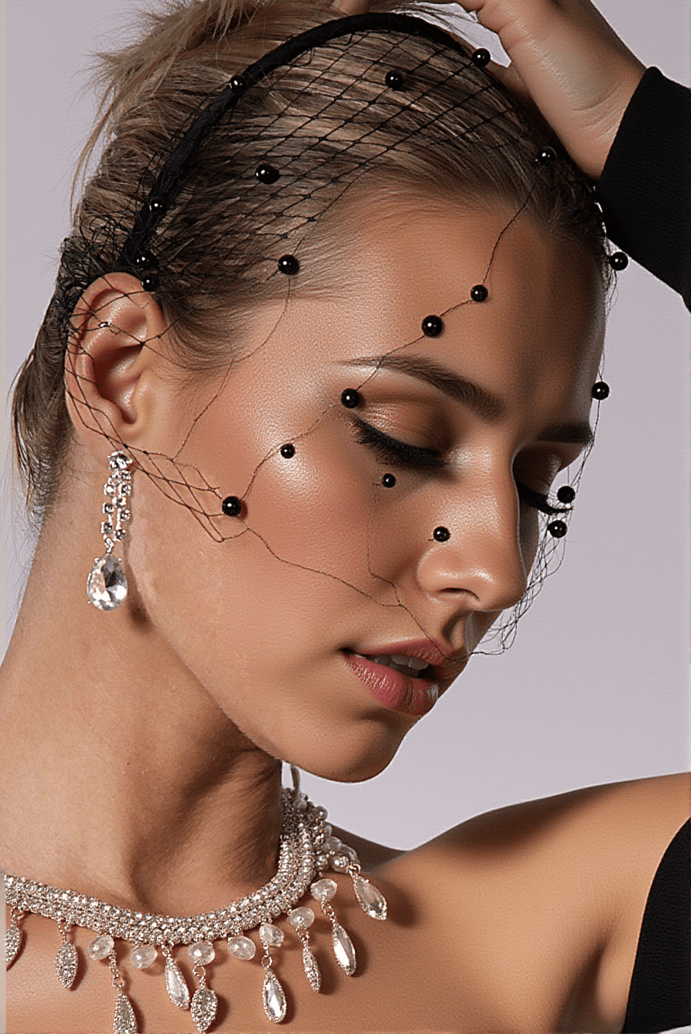 The Fiona Bead Mesh Hairband looks stunning on the model, perfectly accentuating her hairstyle and outfit. Whether paired with an elegant dress or a chic suit, this hairband adds that extra touch of glamour.