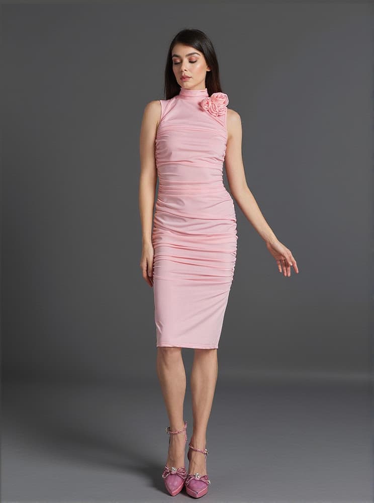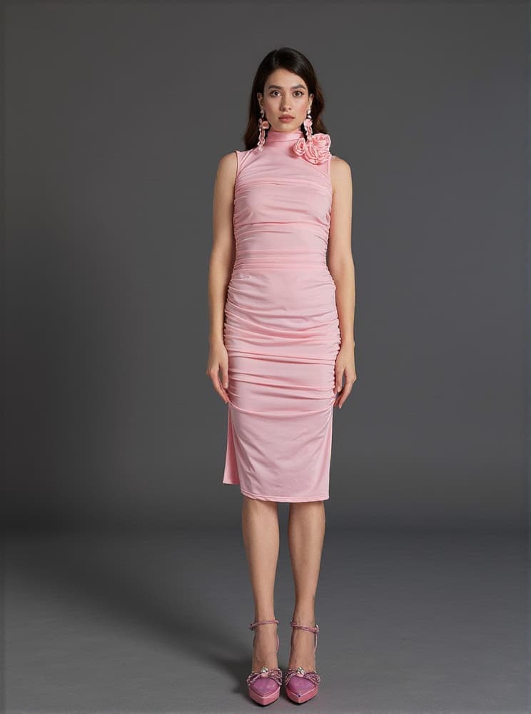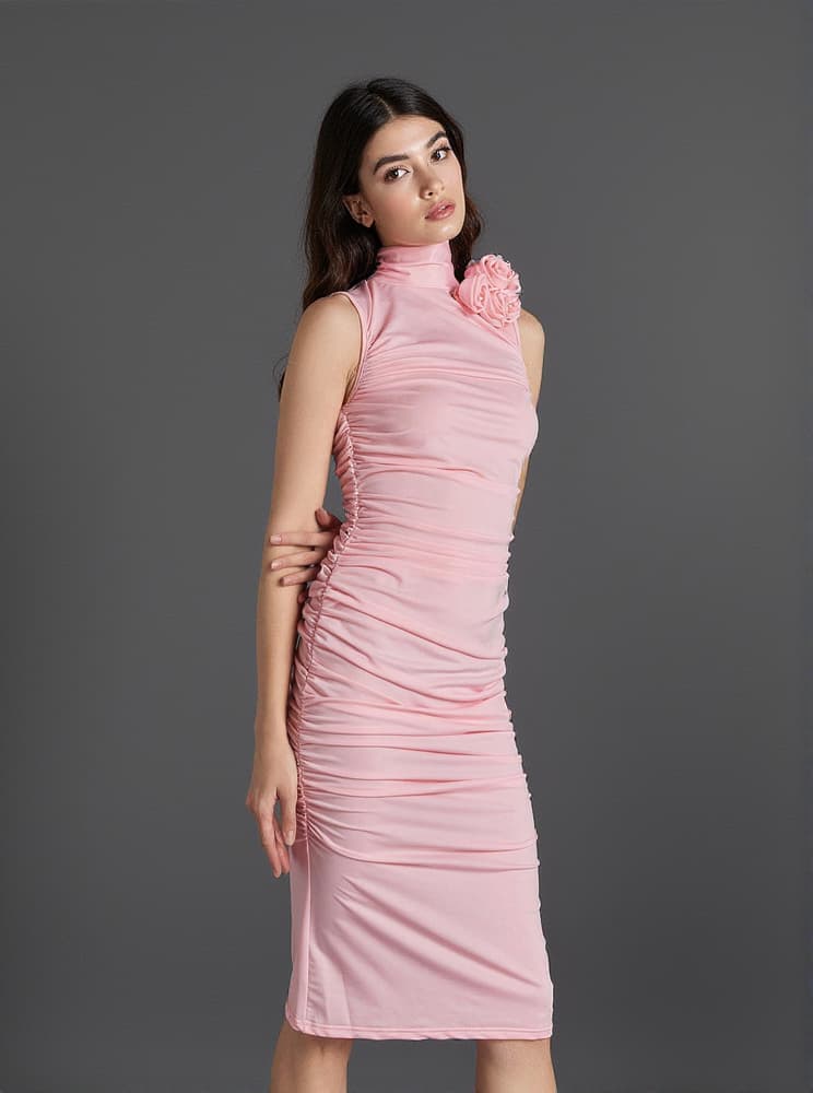 This Fionnuala Flower Ruched Midi Dress offers a romantic-yet-modern look with its 3D flower and ruched detailing. The sleeveless design and midi length make it perfect for a night out or special occasion.