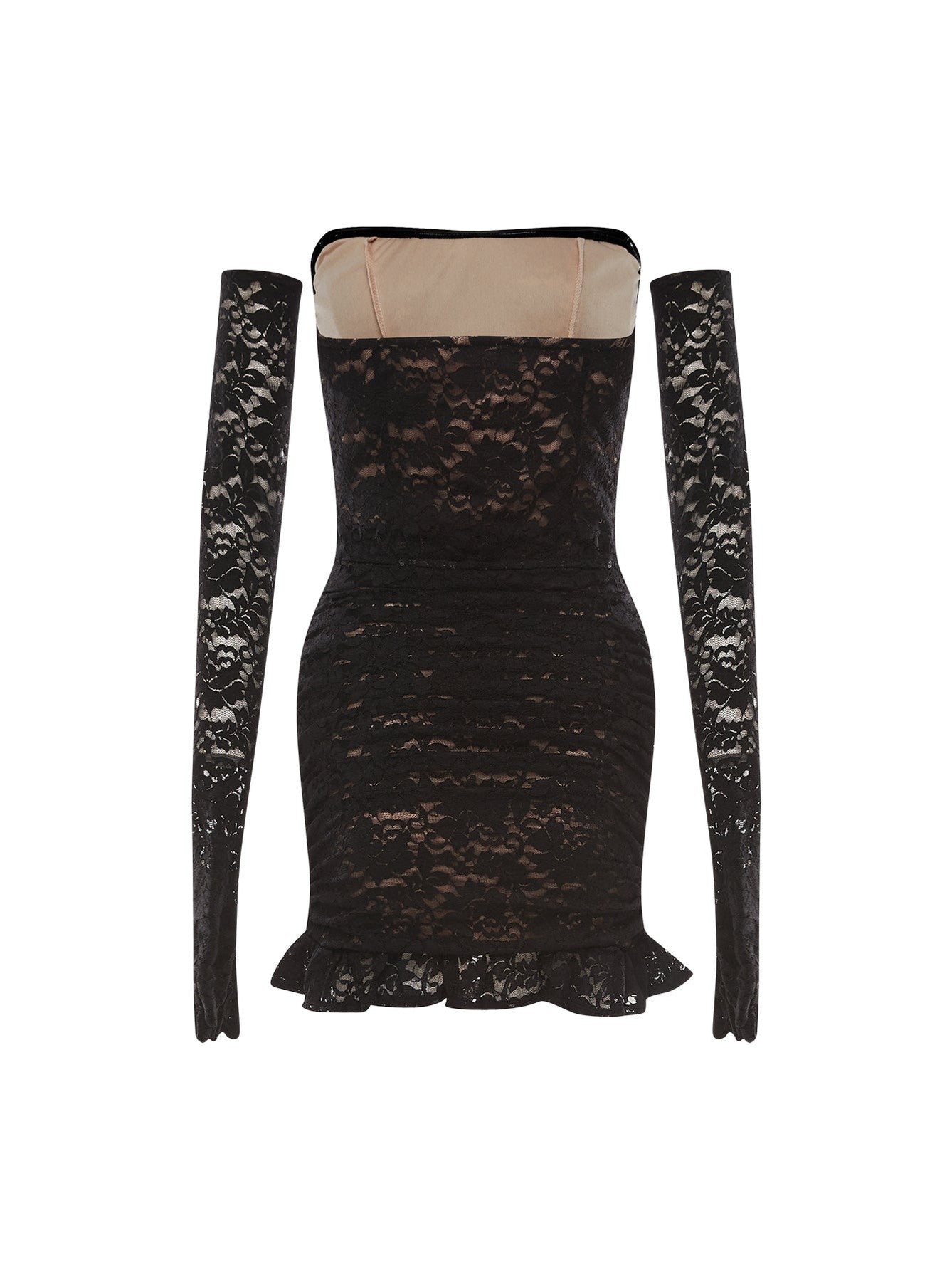 fishbone embellished lace ruffle mini dress in black