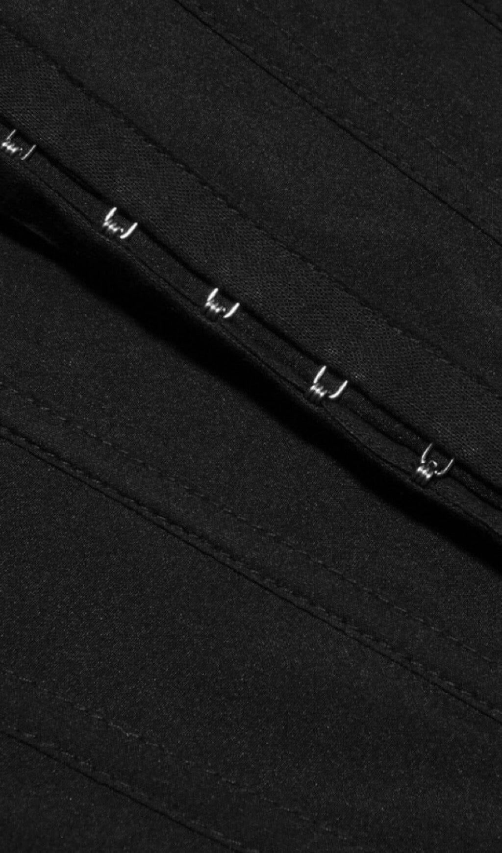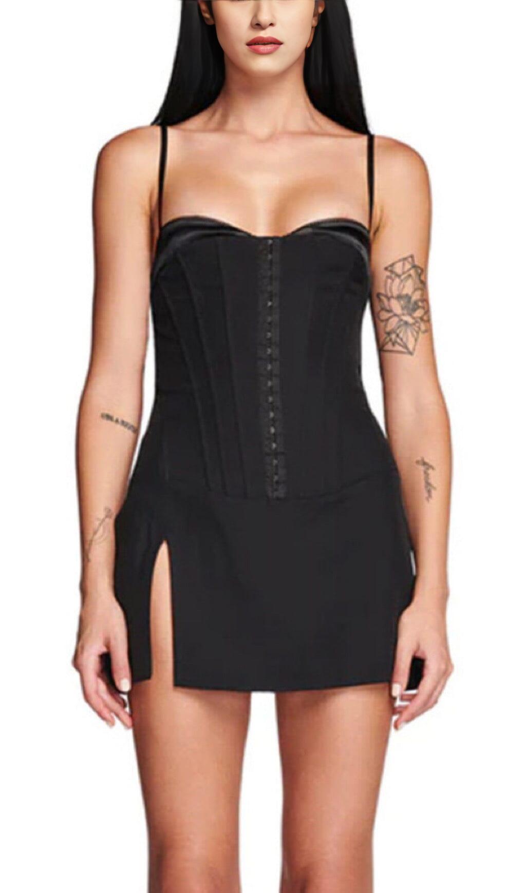 This fishbone suspender mini dress in black is a true fashion statement. Its unique design and attention to detail make it stand out from the crowd. The extended fishbone corset creates a flattering silhouette by cinching in the waistline, while the fake two-piece stitching design adds a touch of sophistication. The high-slit short skirt is both trendy and sexy, perfectly showcasing your legs.