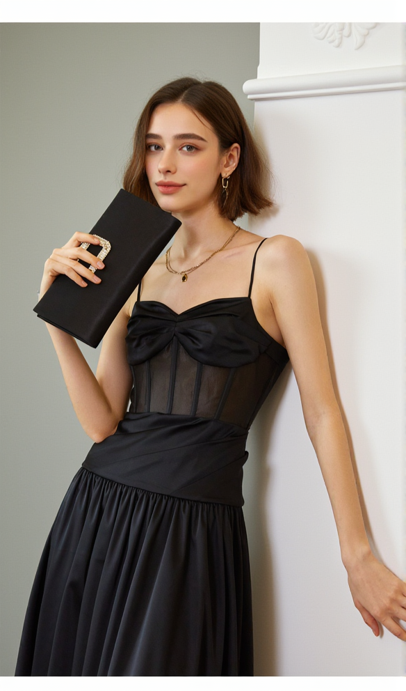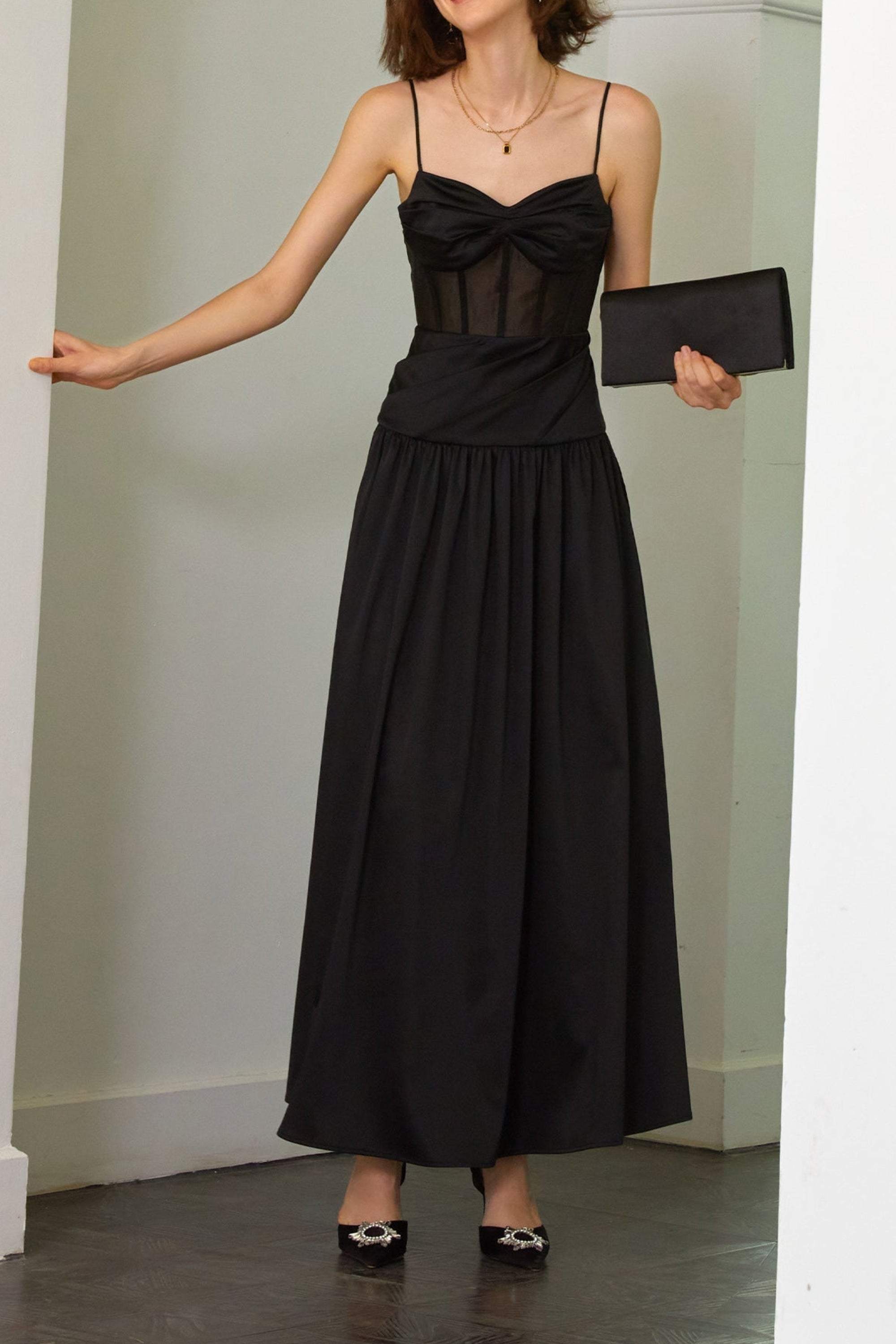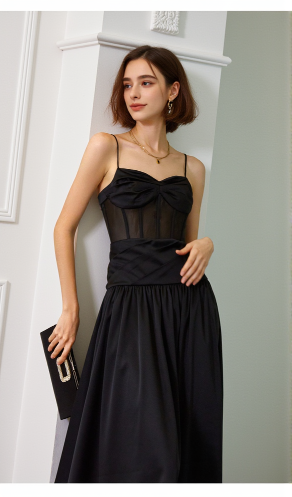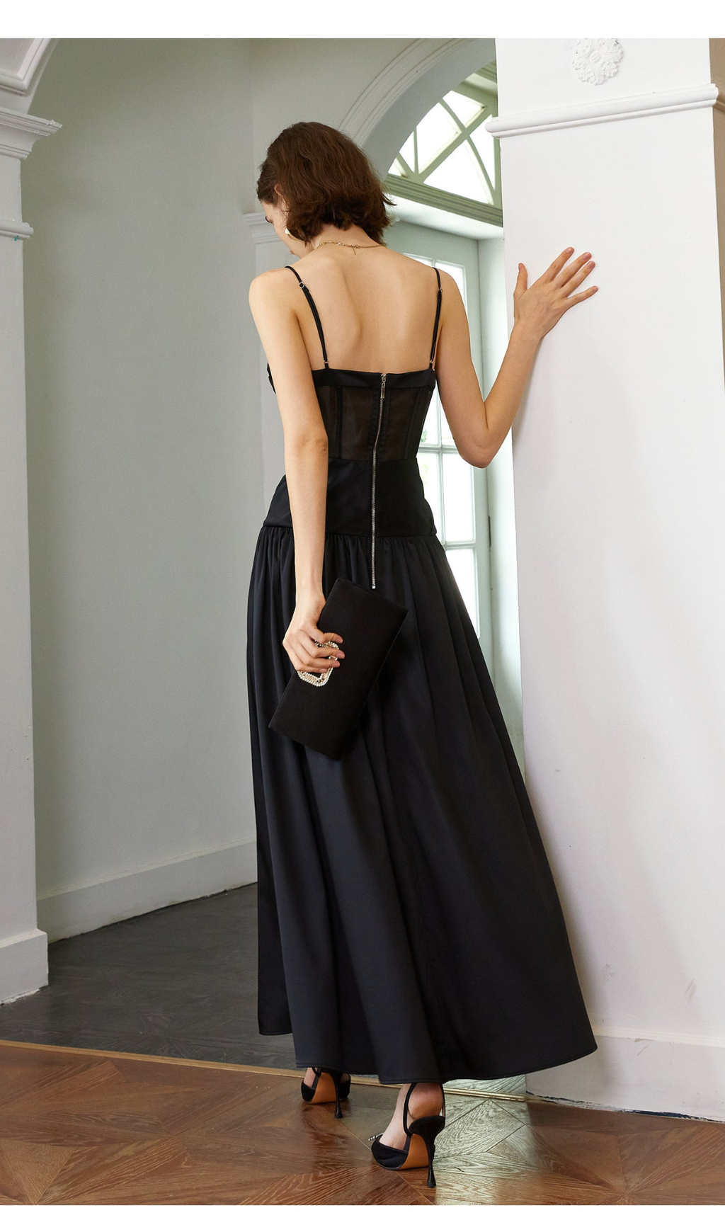 This fishbone tube top dress features a high waistline and long skirt silhouette, perfect for the summer and spring seasons. Crafted in a sleek black hue, it's a timeless look that is sure to be a favorite.