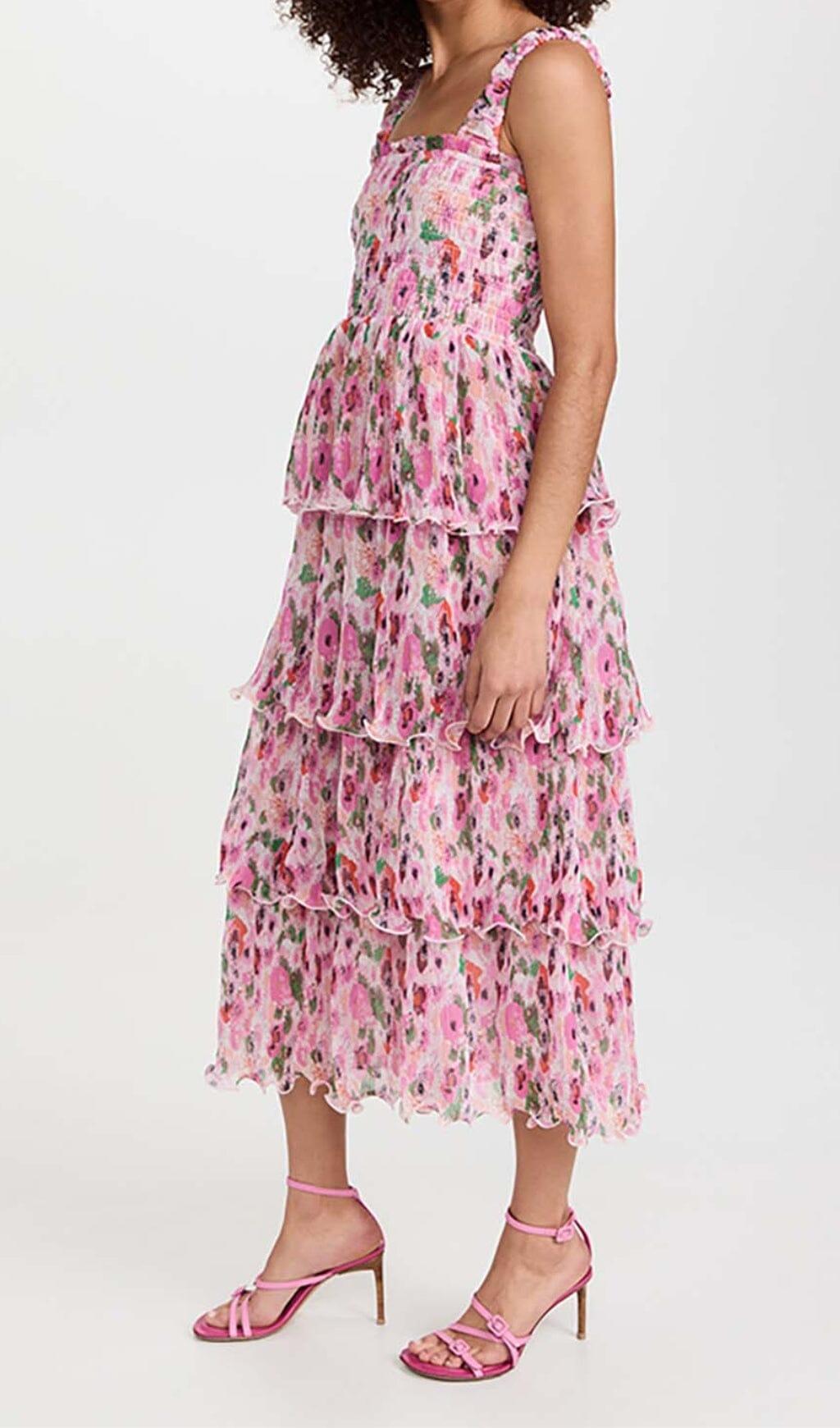 FLORAL-APPLIQUÉ TIERED MIDI DRESS IN PINK