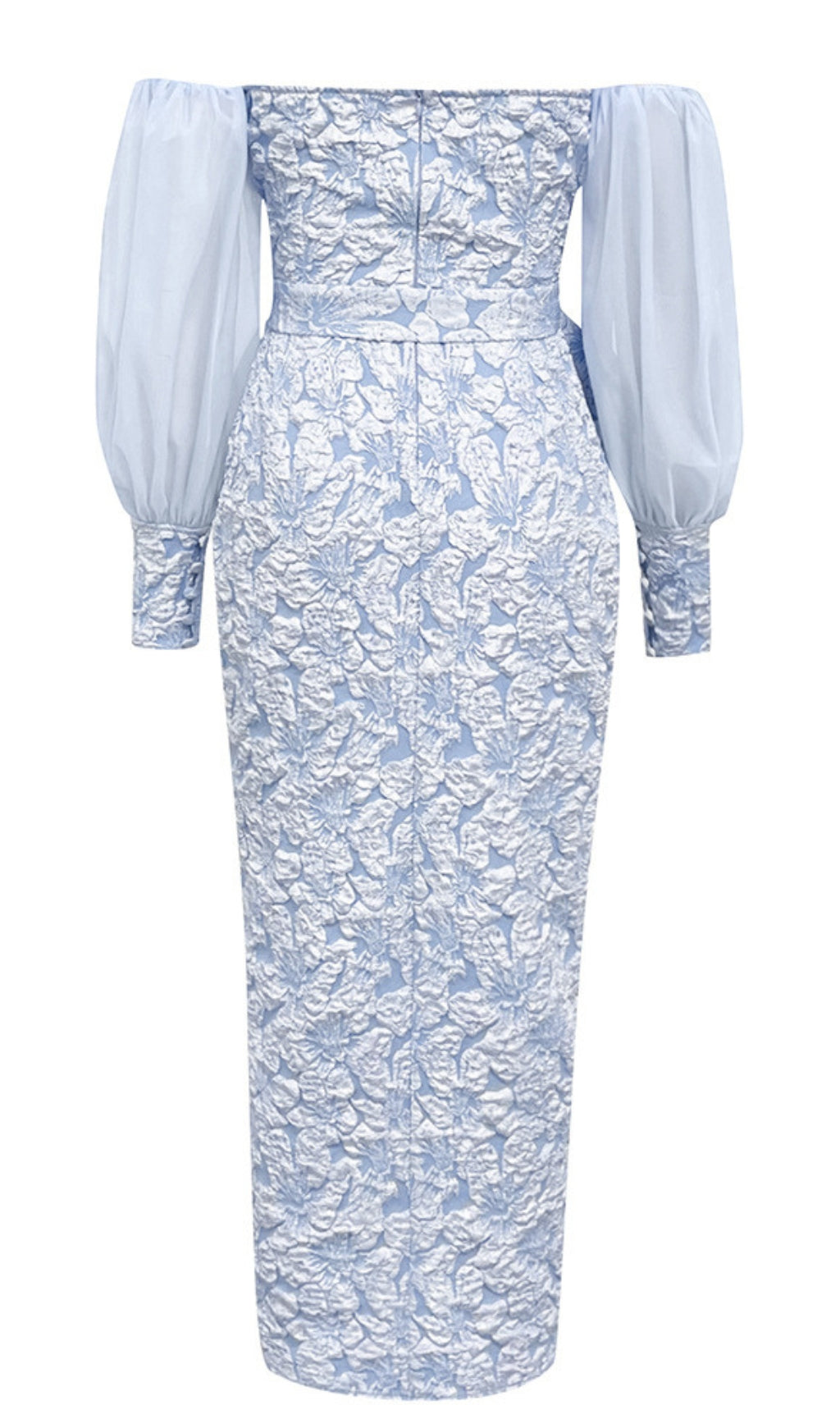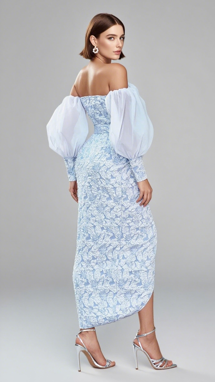 Floral Brocade Off - Shoulder Belted Midi Dress in Light Blue