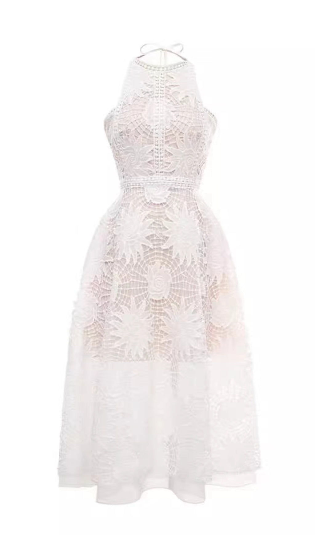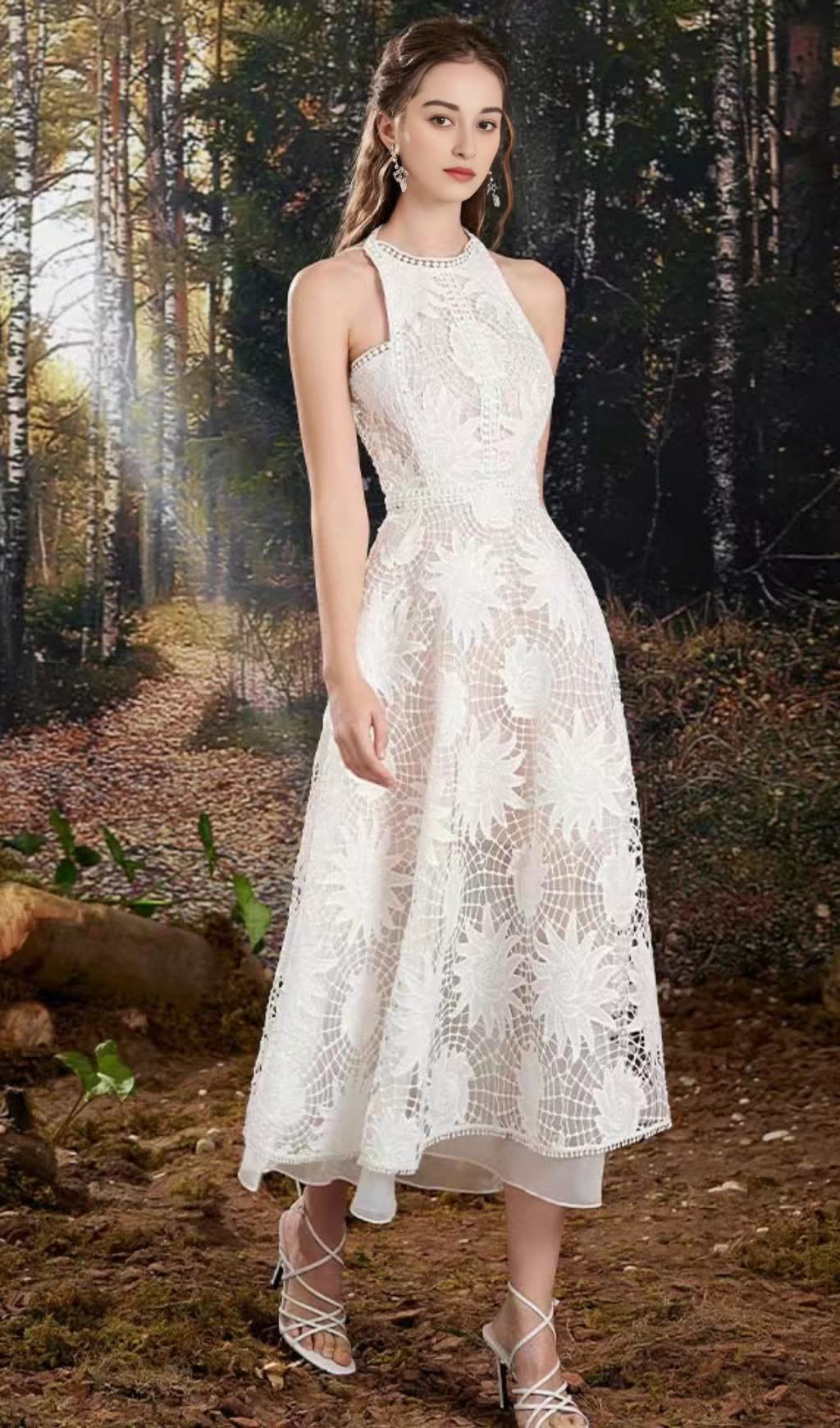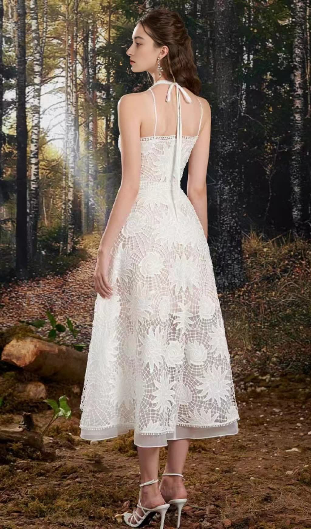 FLORAL EMBELLISHED SLEEVELESS LACE MIDI DRESS
