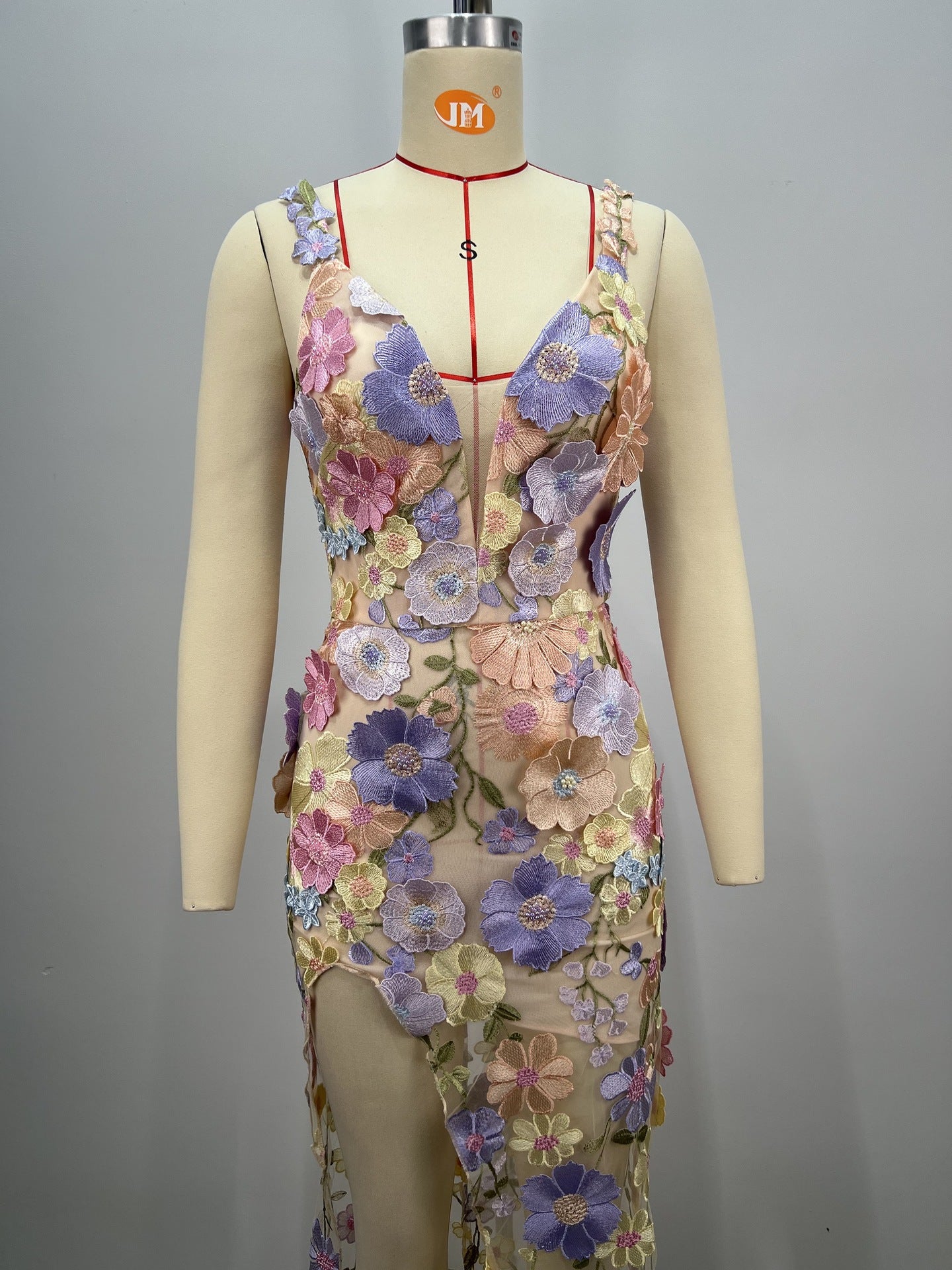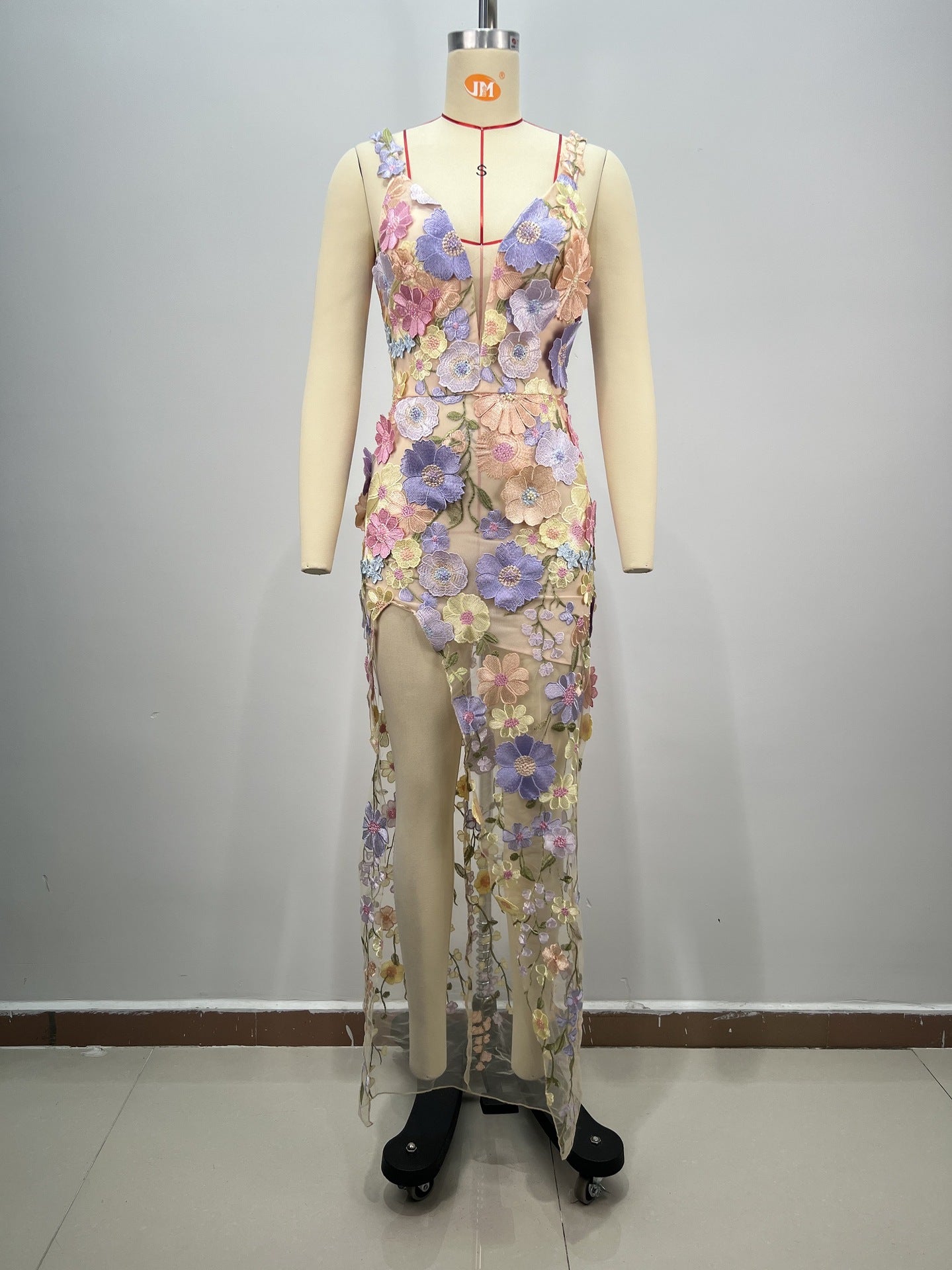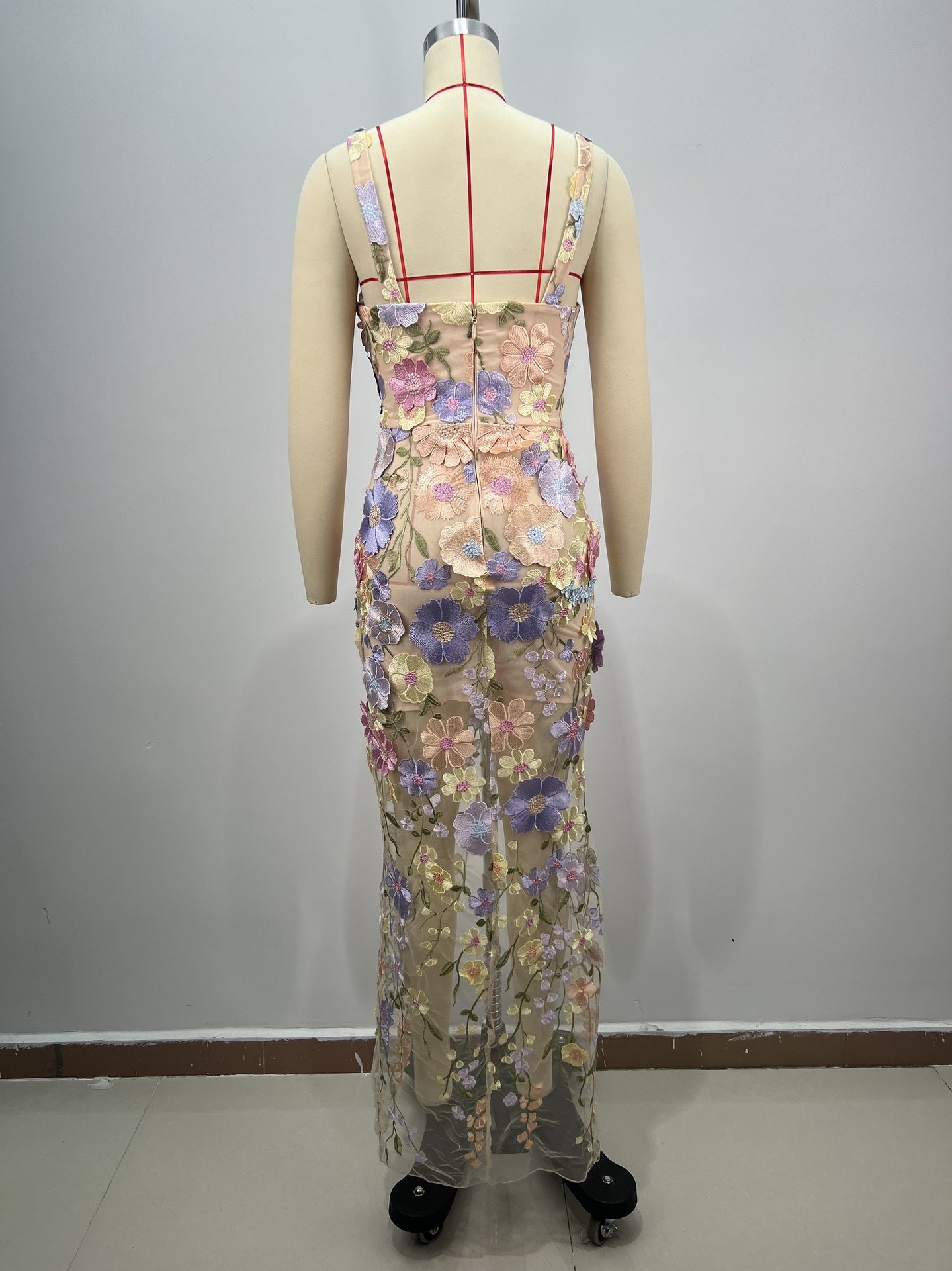 This floral - printed long dress is a masterpiece of elegance and charm. It features a deep V - neckline that gracefully elongates the neck, adding a touch of sensuality. The thin shoulder straps are delicately adorned with flowers, echoing the large - scale floral patterns that cover the entire dress, thus creating a cohesive and romantic aesthetic.