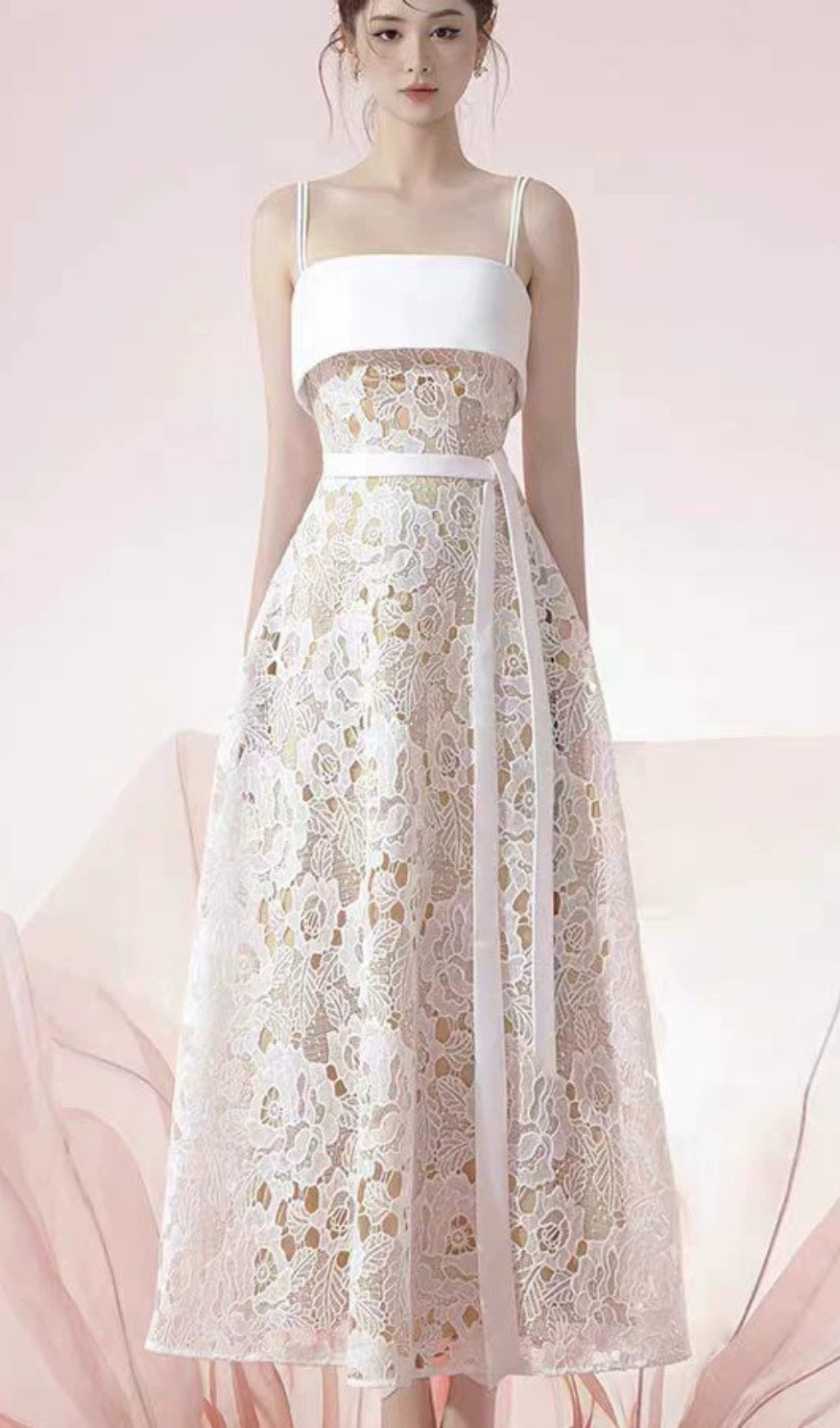 FLORAL EMBROIDERY FLARED MIDI DRESS IN WHITE