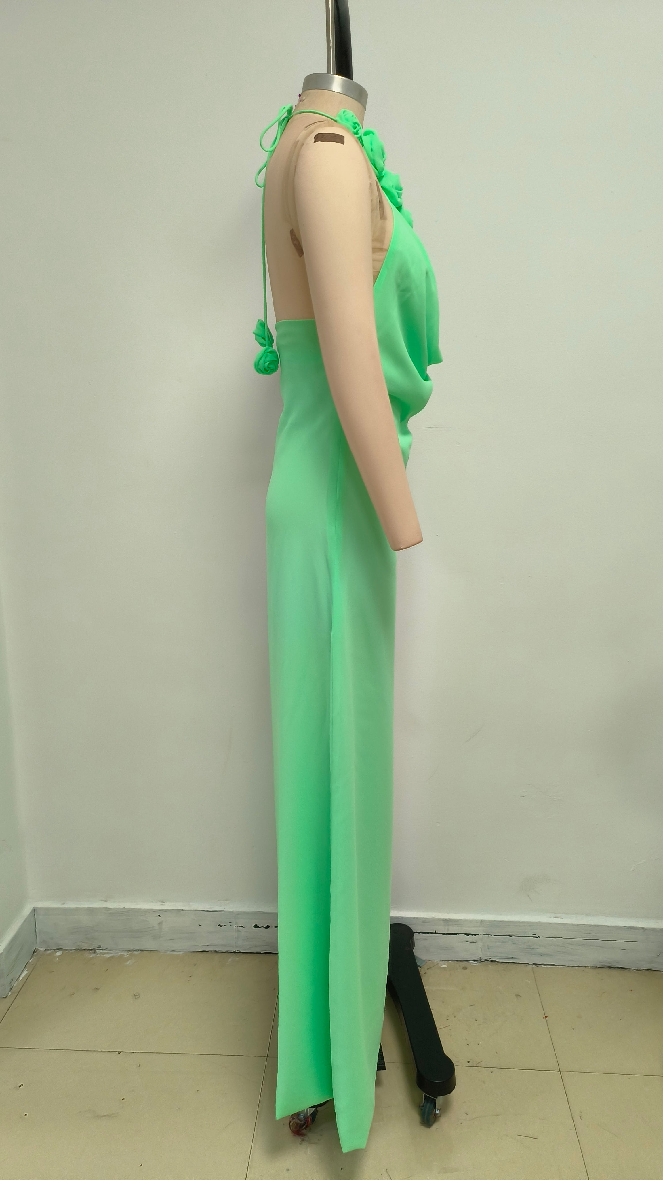 The halter - neck design of this dress elegantly reveals the shoulder and neck lines, exuding both elegance and a hint of sensuality. The neckline is adorned with flower decorations, which add a romantic and gentle charm. These floral embellishments serve as a visual highlight, instantly catching the eye and infusing the dress with a touch of femininity and grace.