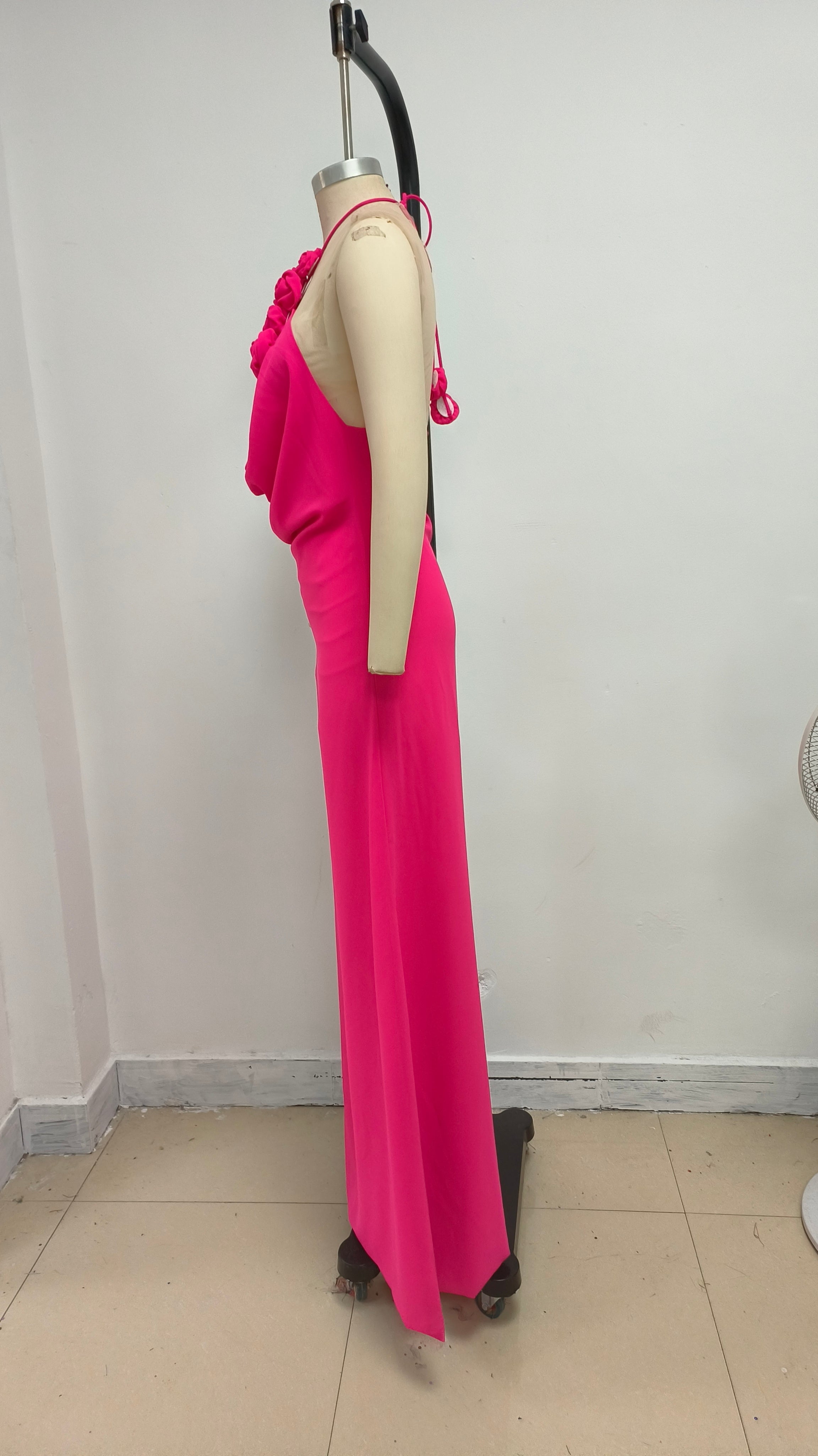 The halter - neck design of this dress elegantly reveals the shoulder and neck lines, exuding both elegance and a hint of sensuality. The neckline is adorned with flower decorations, which add a romantic and gentle charm. These floral embellishments serve as a visual highlight, instantly catching the eye and infusing the dress with a touch of femininity and grace.