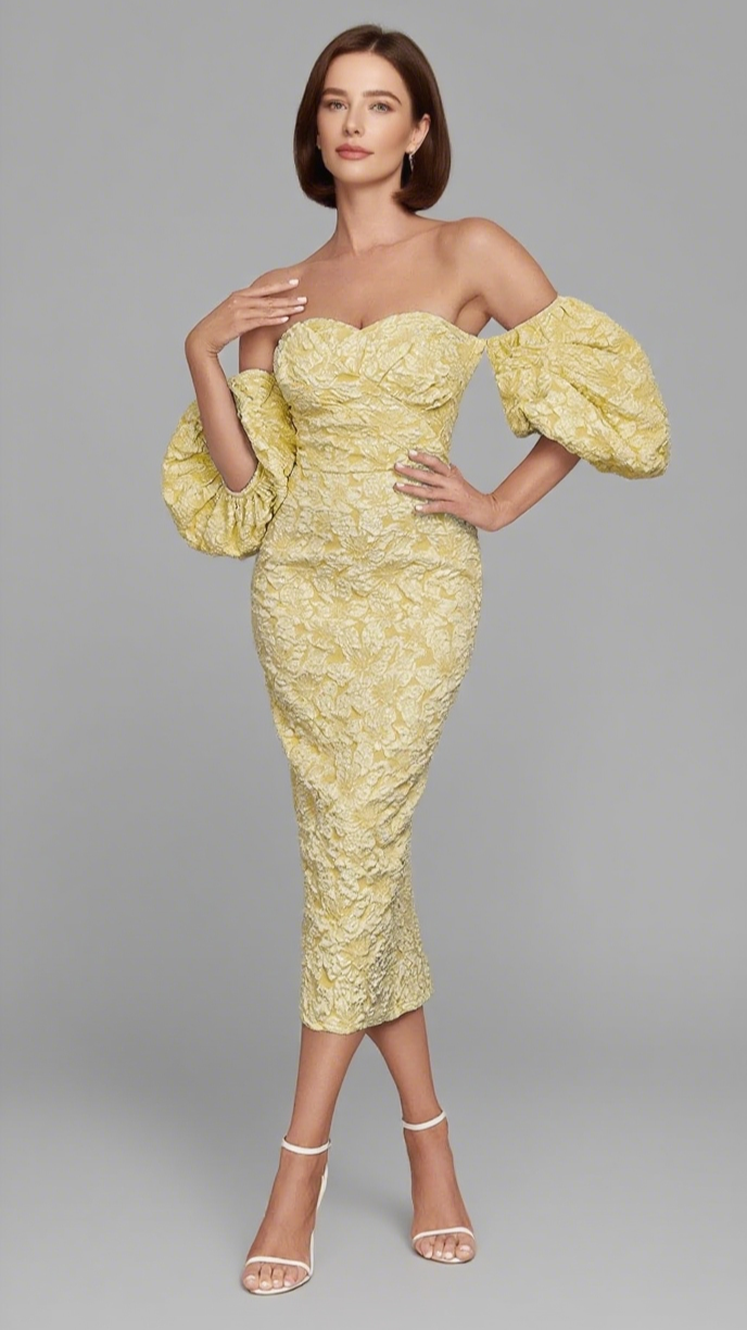 This yellow dress features floral - jacquard fabric, off - shoulder design, and puffed sleeves. It��s a unique hoco dress, perfect for homecoming events. Ideal as hoco dress inspo, it suits fall gatherings, new years eve parties, or elegant outings. The textured pattern and chic silhouette help you dress to impress, ensuring you stand out at any formal or semi - formal occasion.