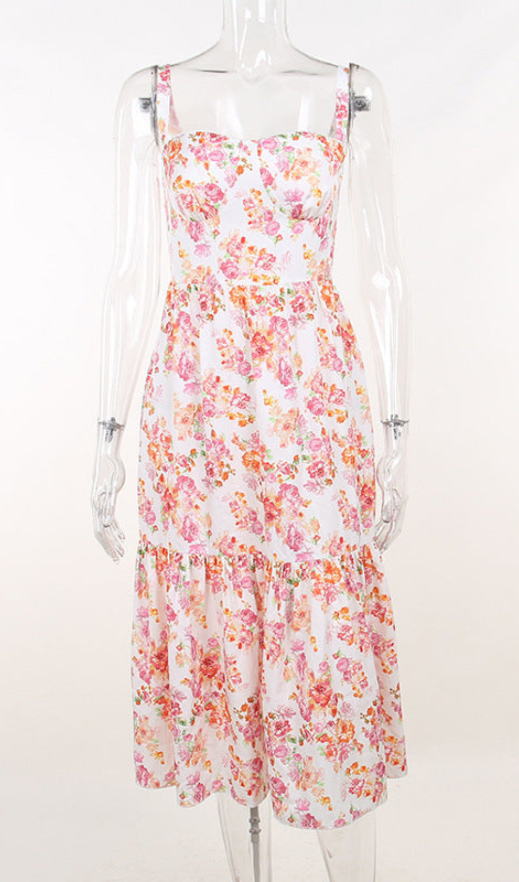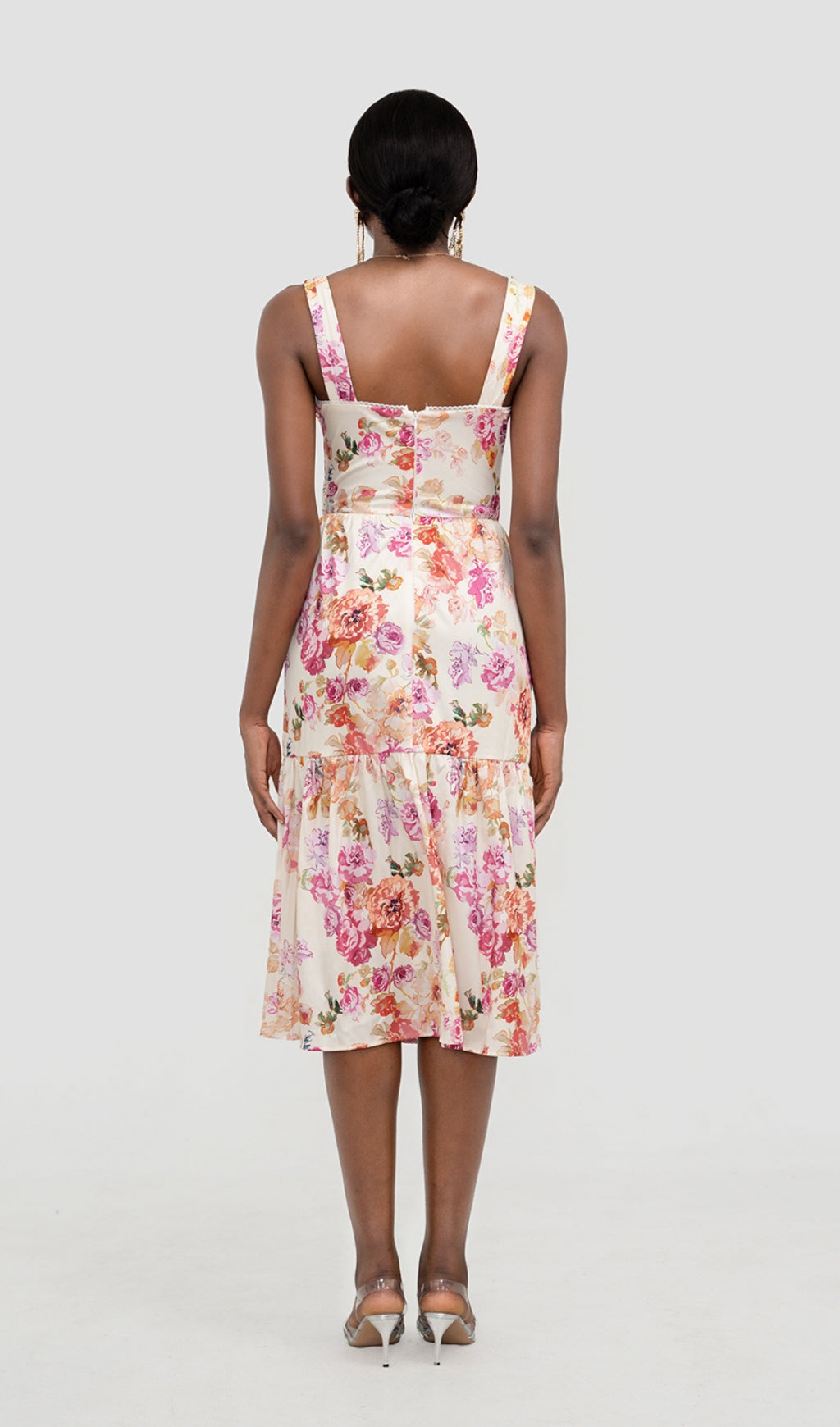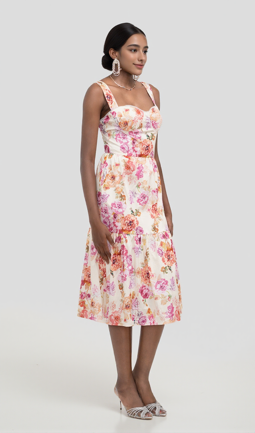 This midi-length dress is crafted from ivory cotton and adorned with subtle floral embroidery. Its flowy silhouette and charming details make it the perfect choice for any special occasion.