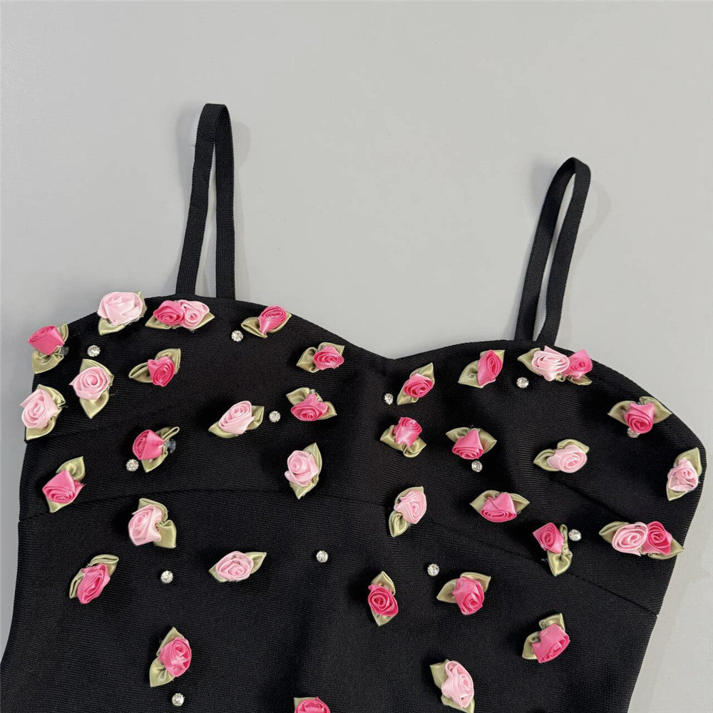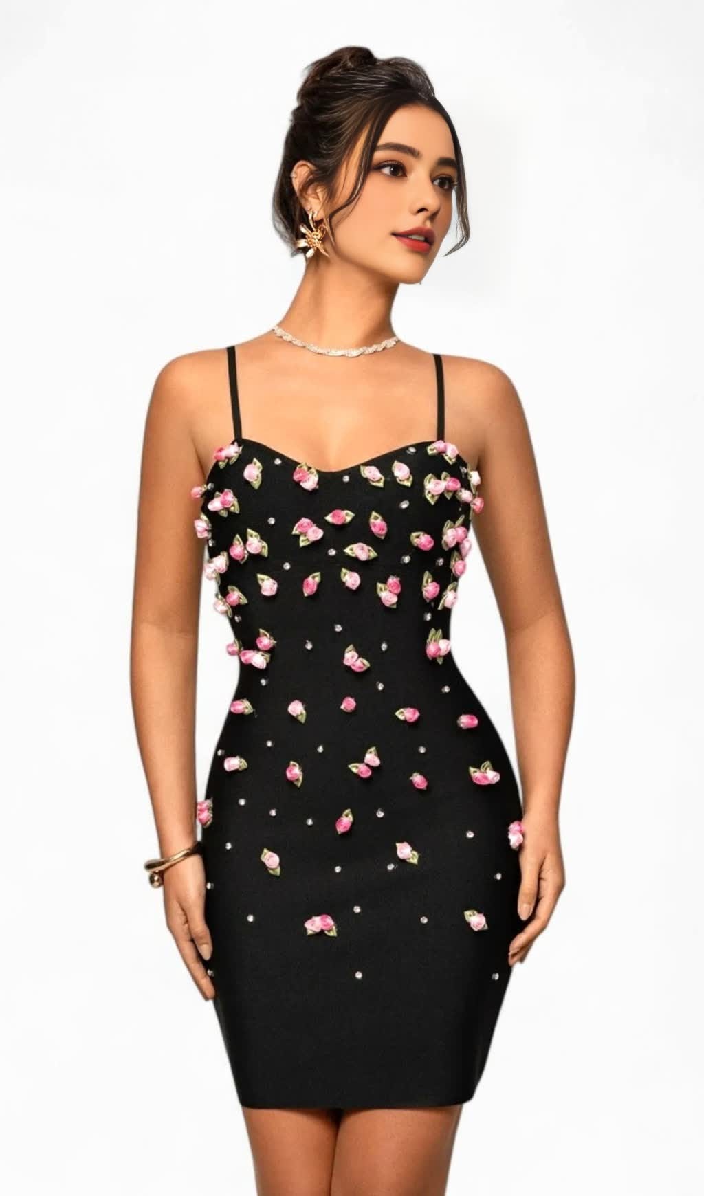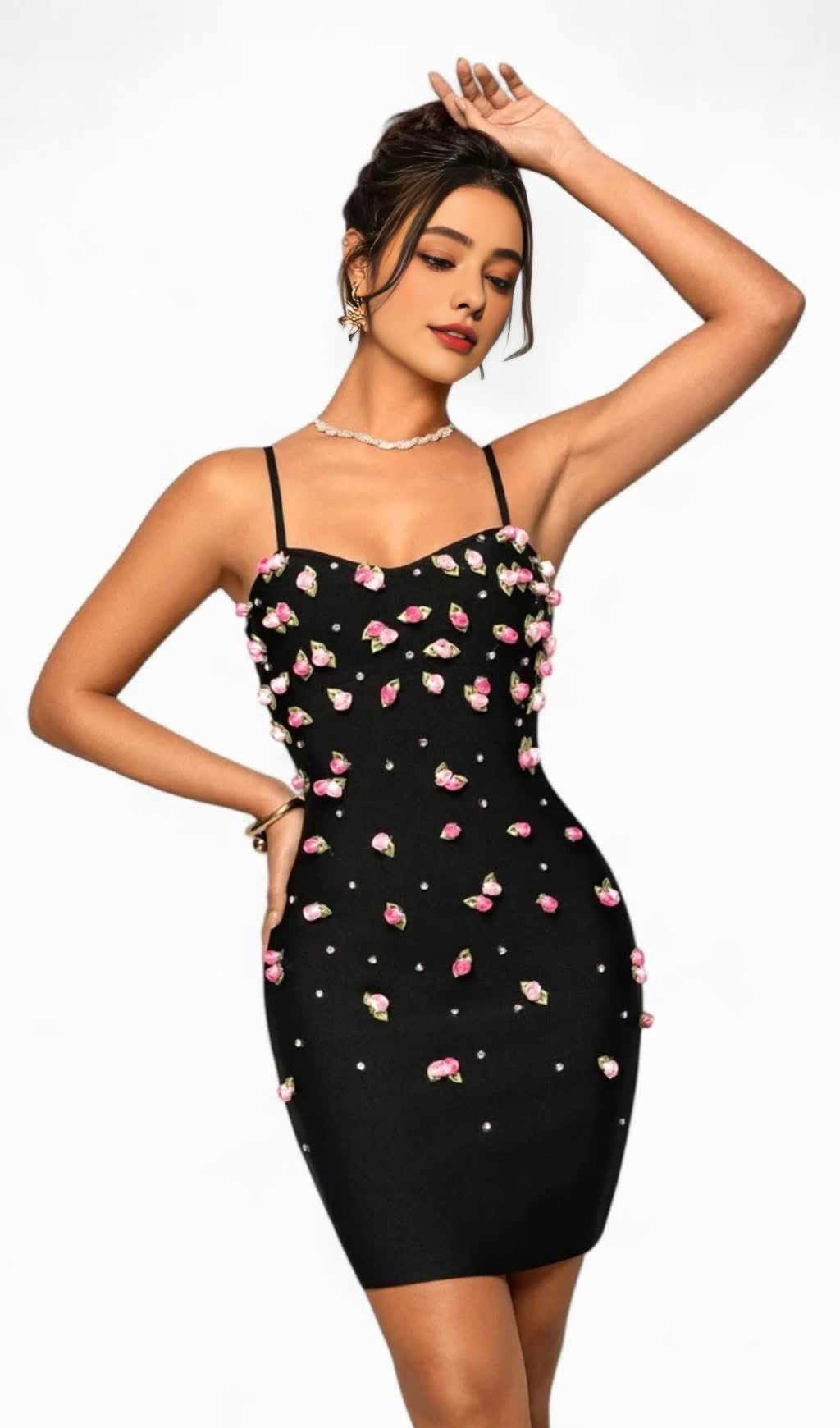Skirt Body: It is a form - fitting pencil skirt style that clings to the body curves, highlighting the wearer's figure advantages. The skirt is adorned with pink flowers all over, interspersed with small rhinestones, which enriches the visual hierarchy and adds a sense of luxury and delicacy.