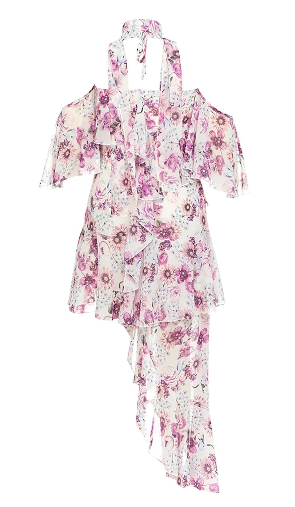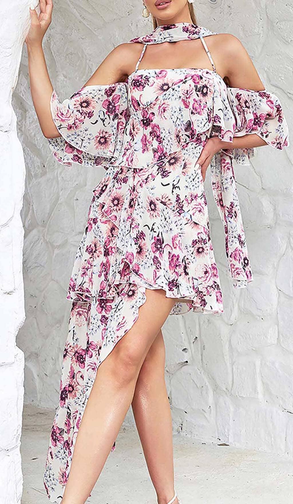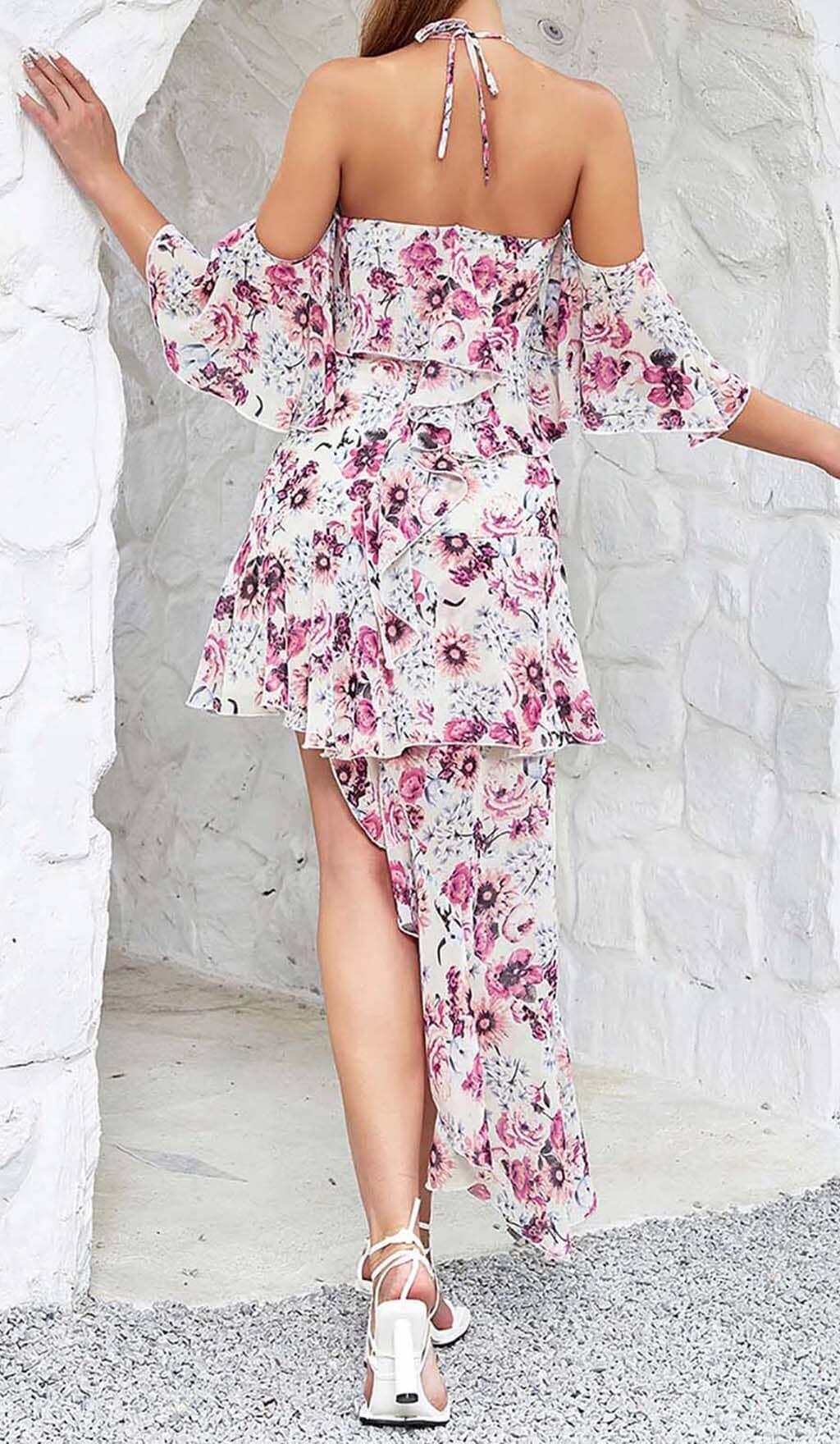 FLORAL PRINT COLD SHOULDER HALTER HIGH LOW DRESS