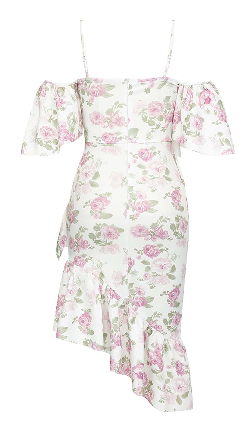 Elevate your style with this floral-print ruffle bandeau midi dress in white. Order yours today and be prepared to turn heads wherever you go!