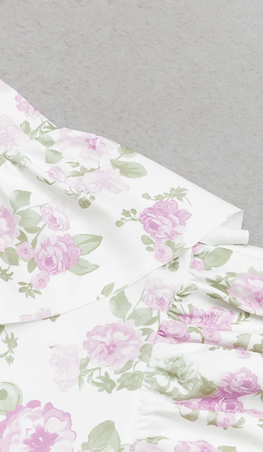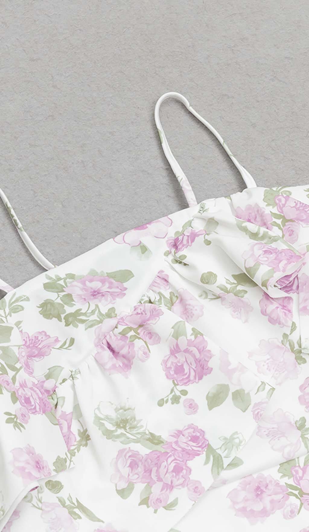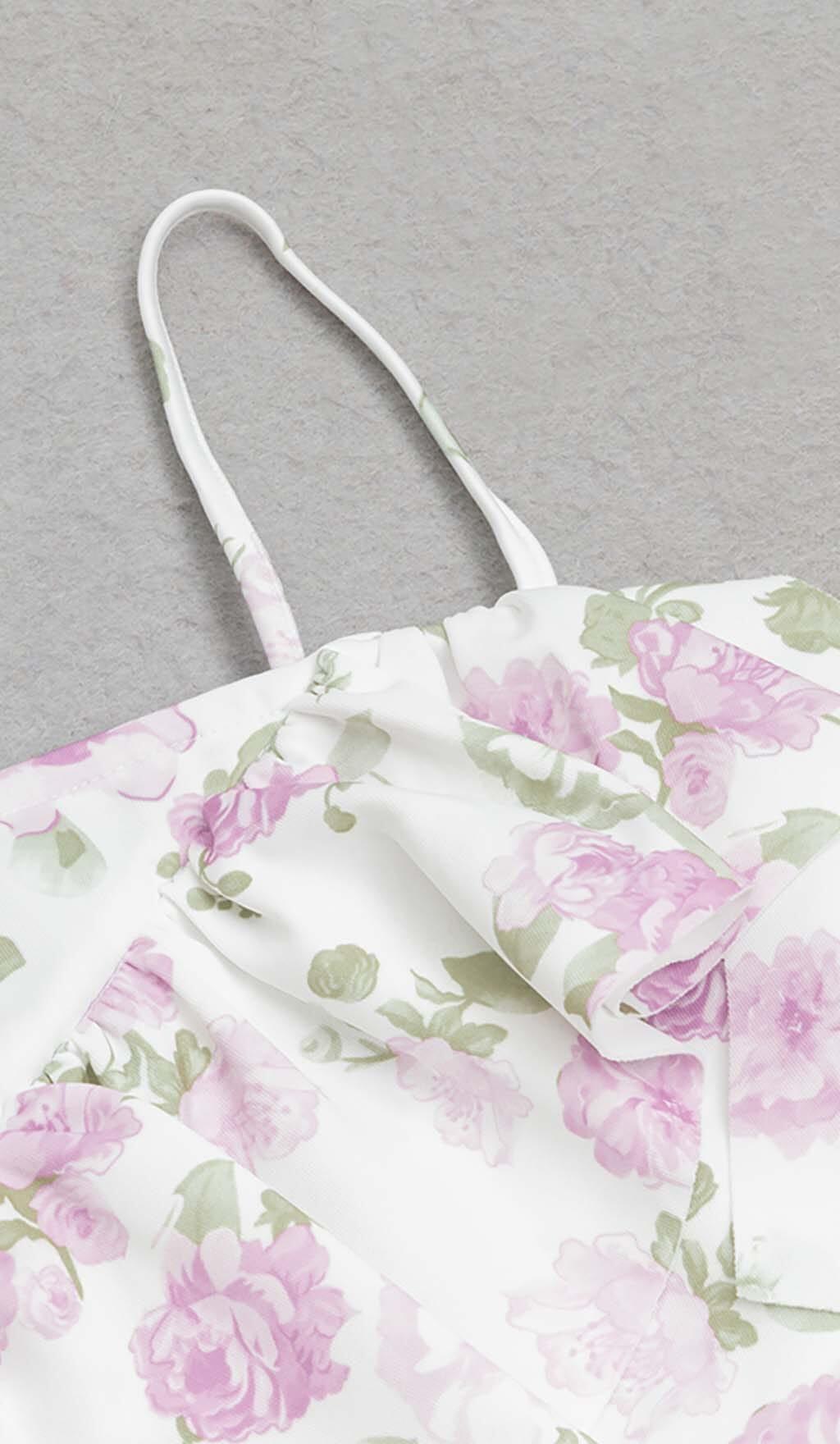 FLORAL-PRINT RUFFLE BANDEAU MIDI DRESS IN WHITE
