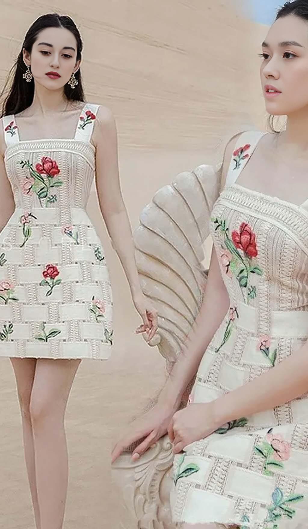 • The bursts of vibrant blooms on the dress create a cheerful and eye-catching look.