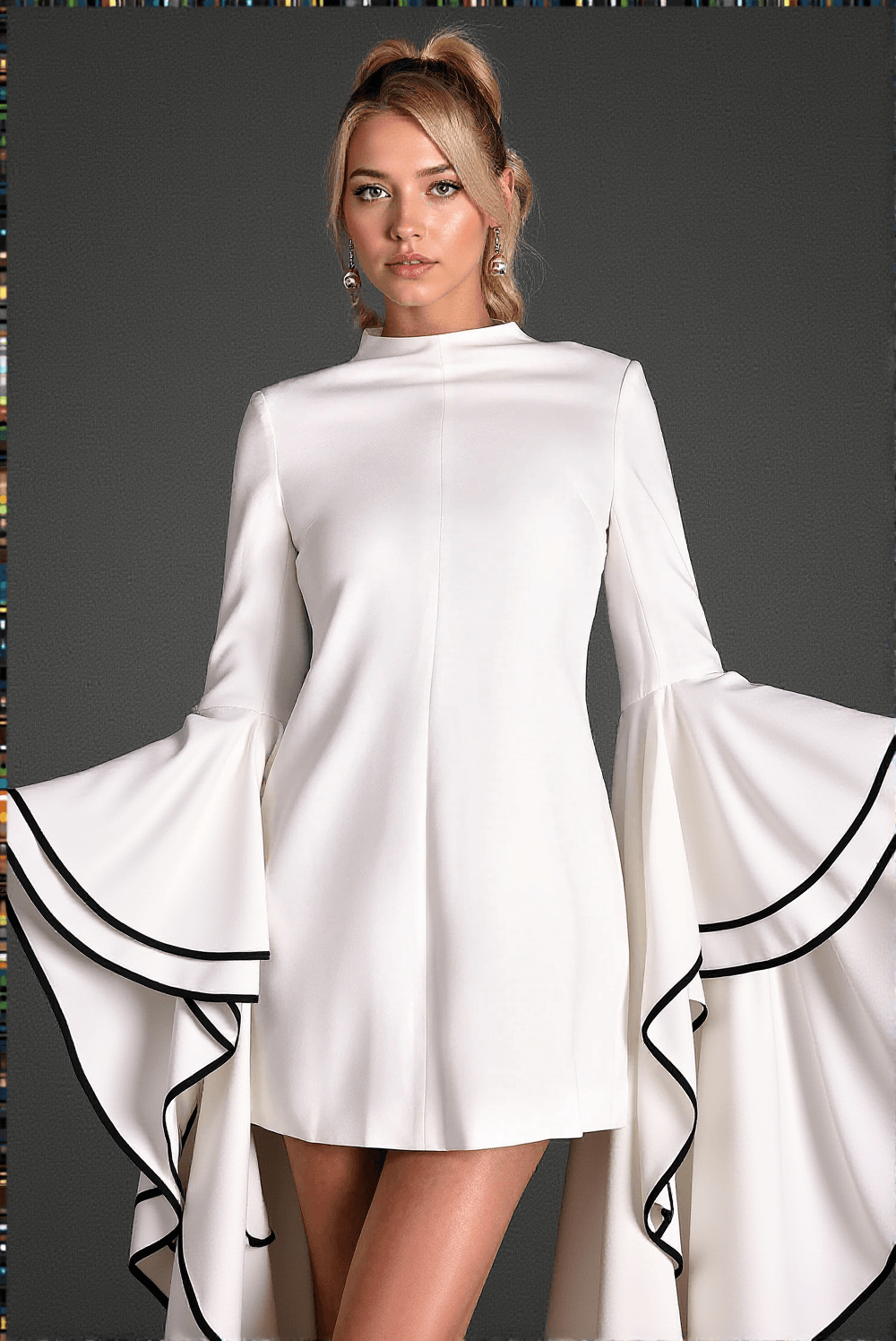 The high neckline subtly highlights your features while providing coverage that feels elegant and modern. Paired with the intricate details of ruffled sleeves, this mini length silhouette ensures you stand out at any event or casual outing.