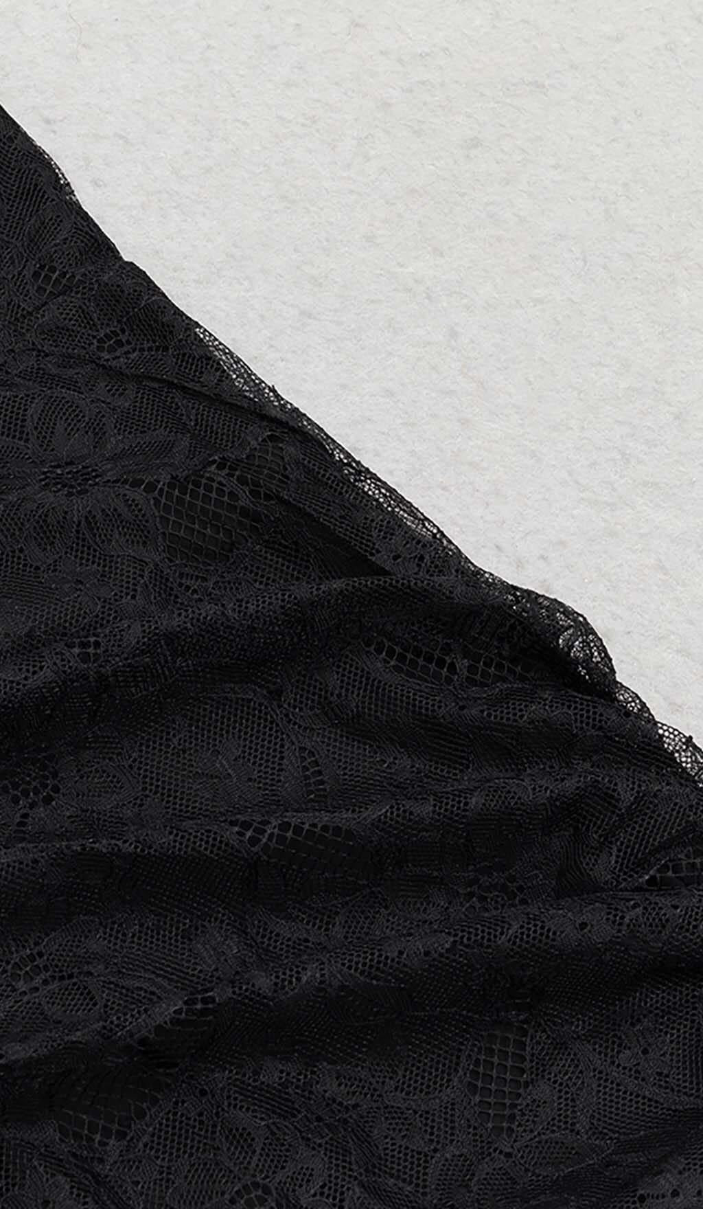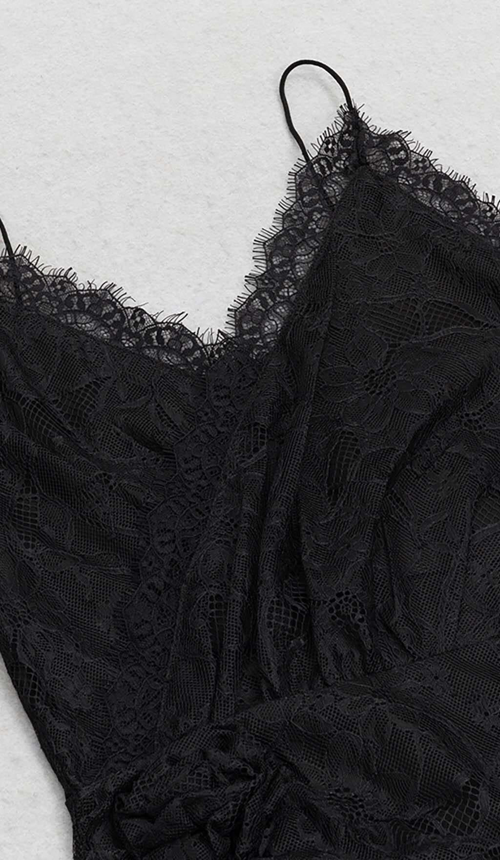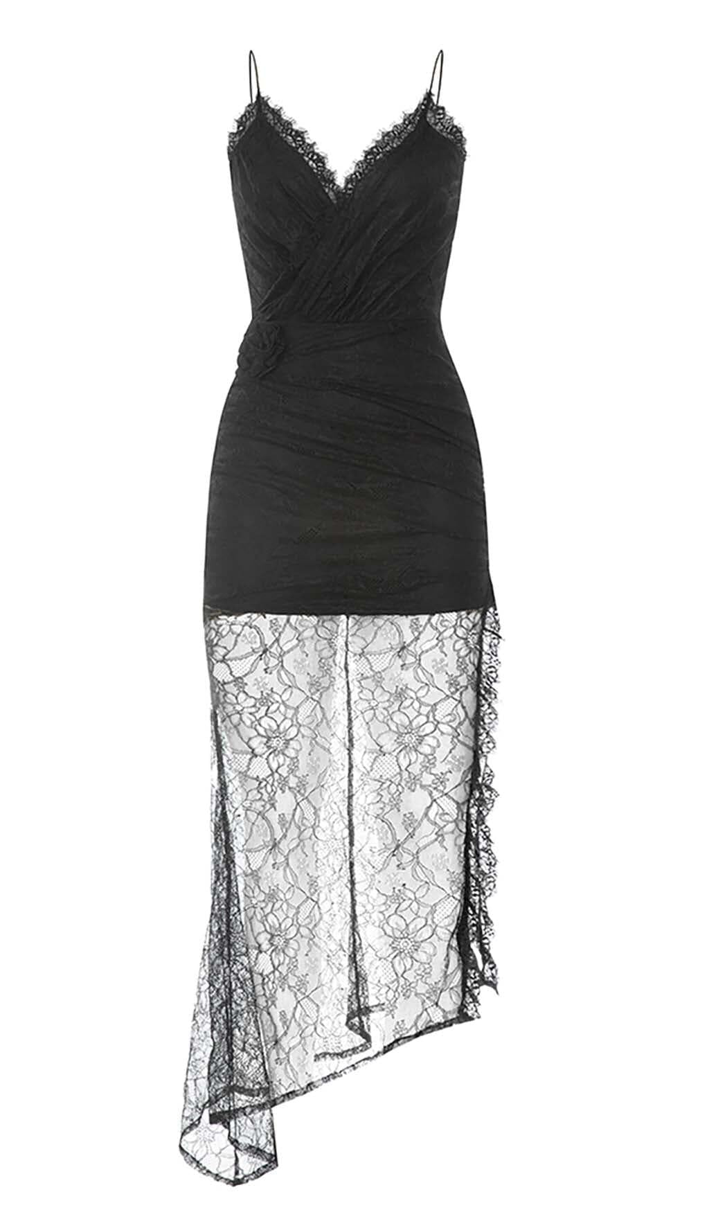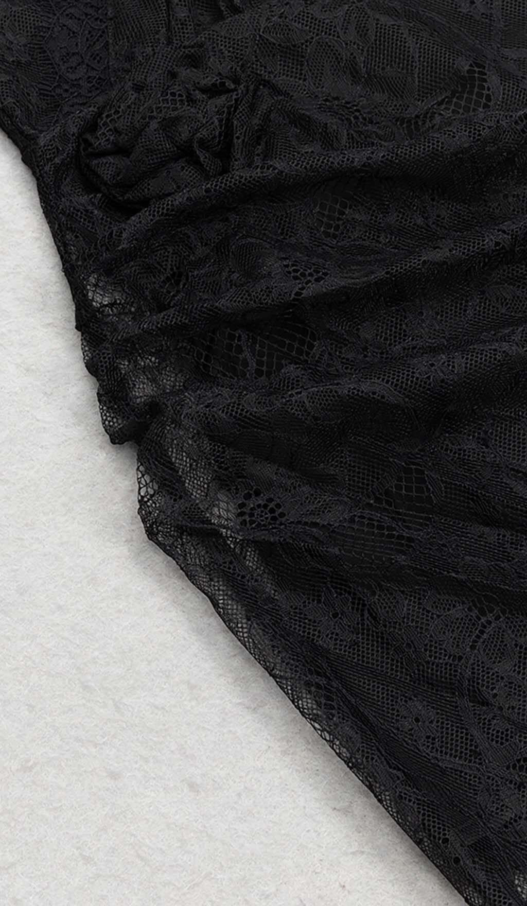 FLOWER APPLIQUE LACE MIDI DRESS IN BLACK