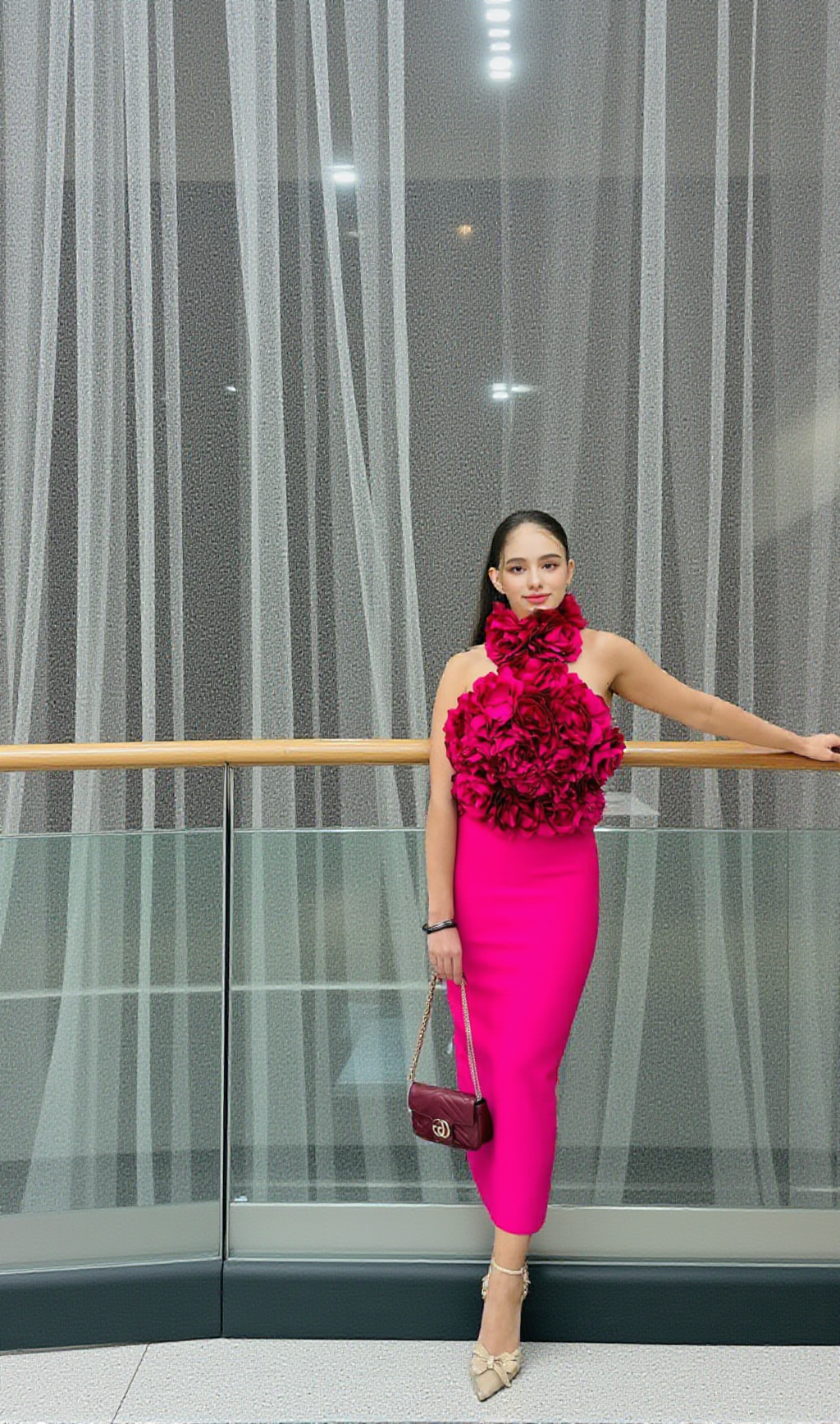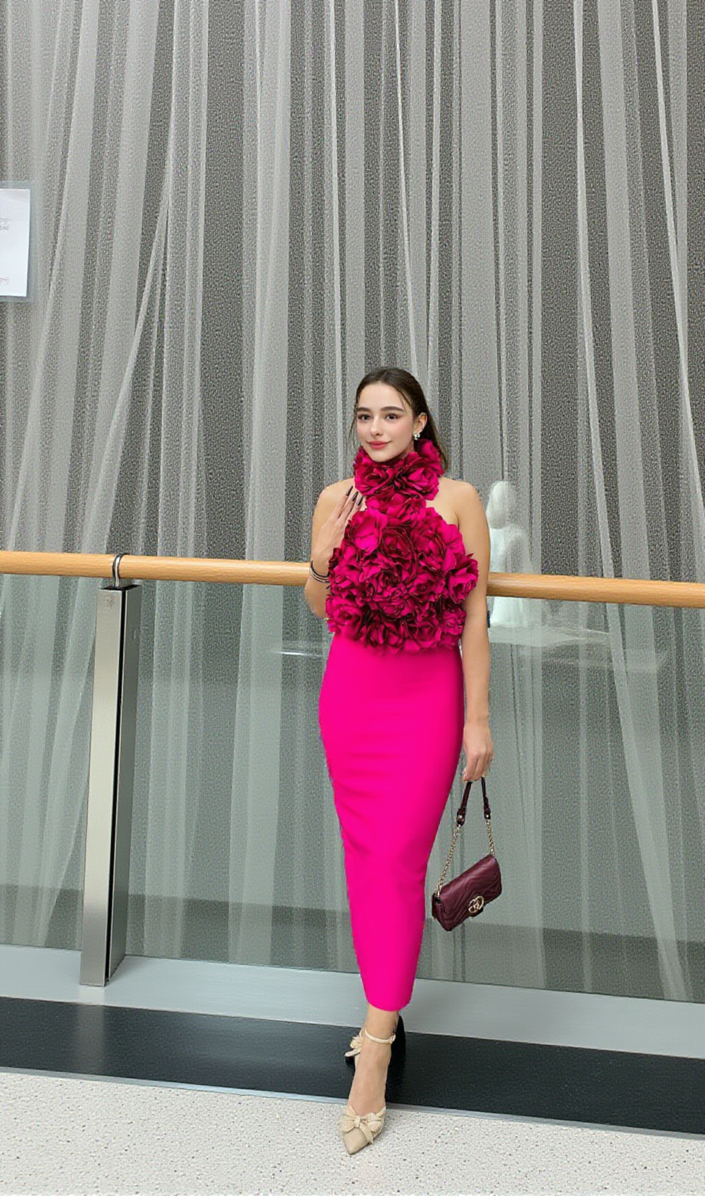 This beautiful flower bandage midi dress in hot pink is a must-have for any fashion-forward individual. Its delicate flower detailing adds a touch of femininity, while the bandage fabric creates a flattering silhouette. Perfect for any occasion, this dress is sure to make a statement.