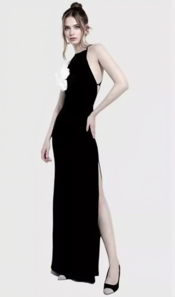 The black mesh fabric is adorned with delicate floral embroidery, creating a stunning contrast. This dress is perfect for any special occasion and will make you feel confident and beautiful. Elevate your style with this unique and captivating piece.