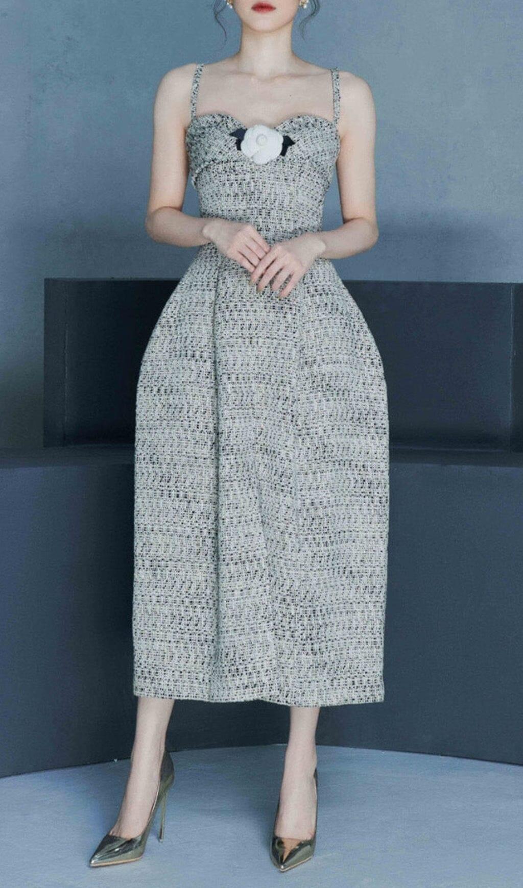 FLOWER EMBELLISHED MIDI DRESS IN GRAY