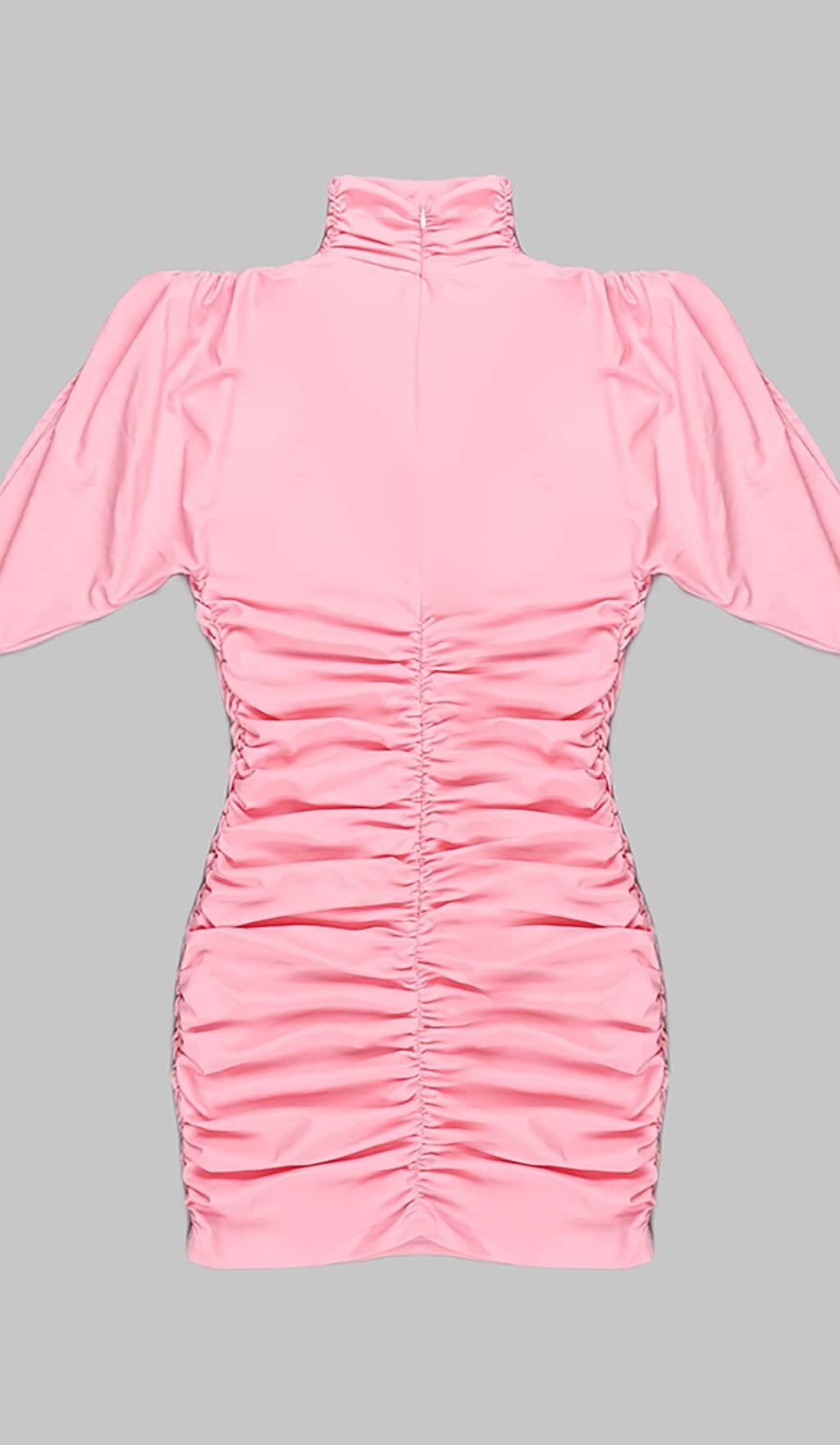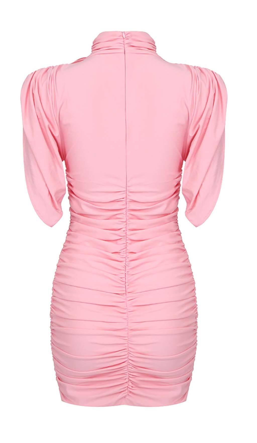 FLOWER-EMBELLISHED RUCHED MINI DRESS IN PINK
