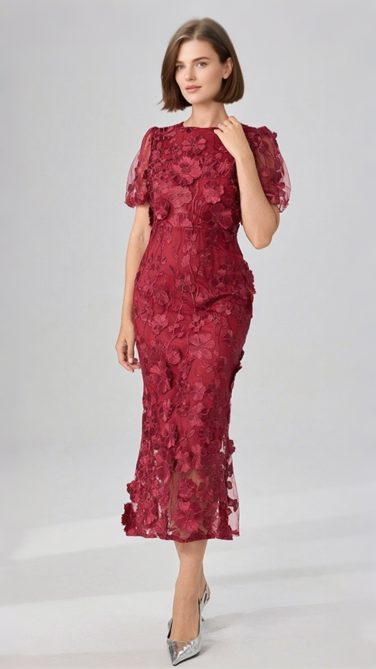 The Flower Mesh Maxi Dress In Red features intricate three-dimensional floral embroidery. a classic crew neckline. and elegant puff sleeves. This figure-flattering mid-length dress in airy mesh is perfect for special occasions. combining sophistication with contemporary style.