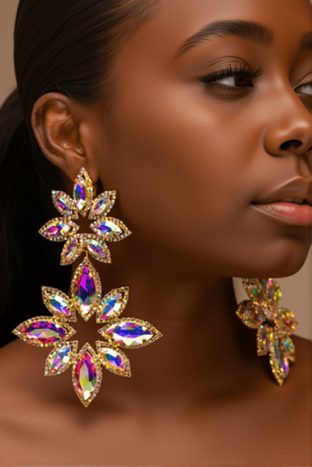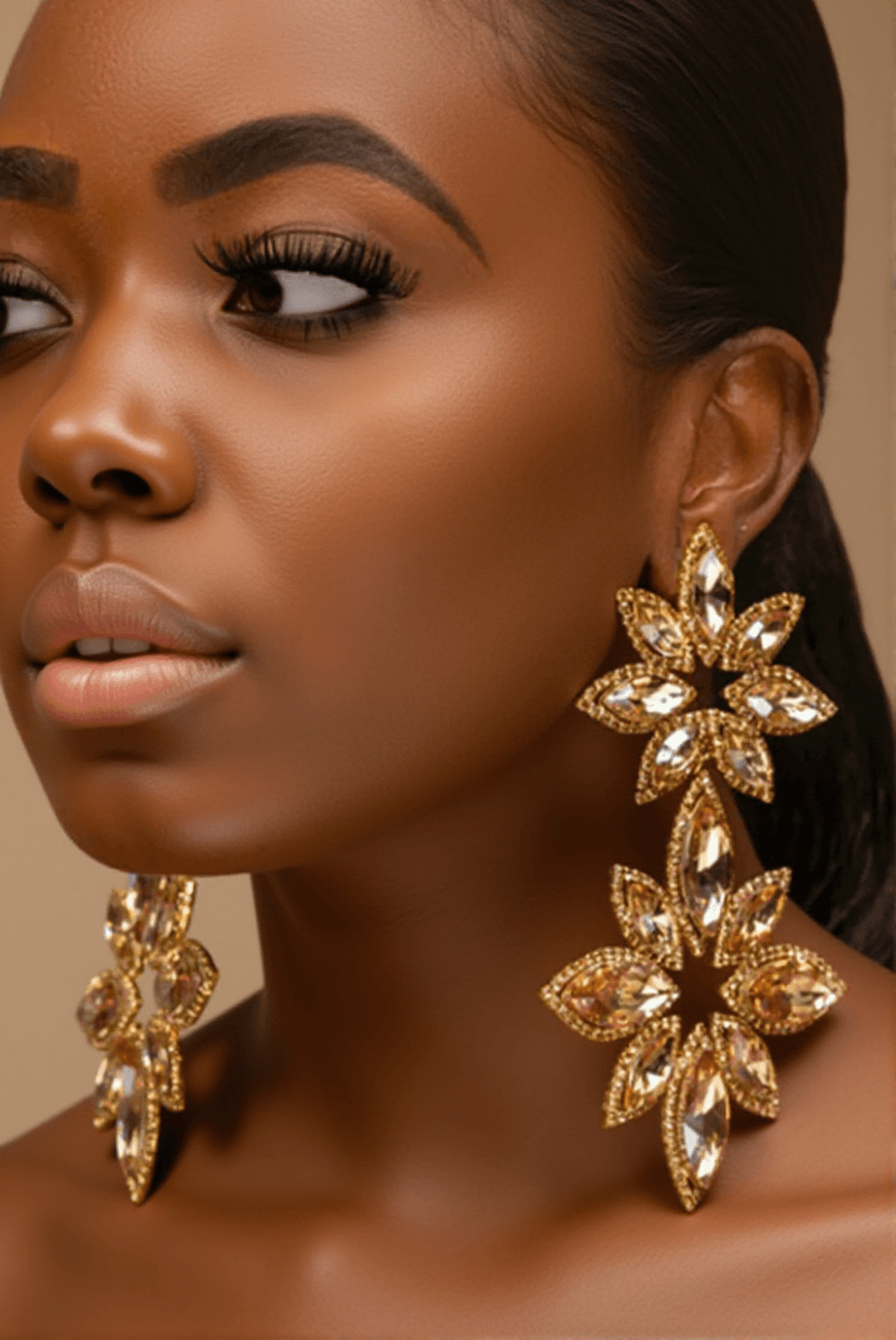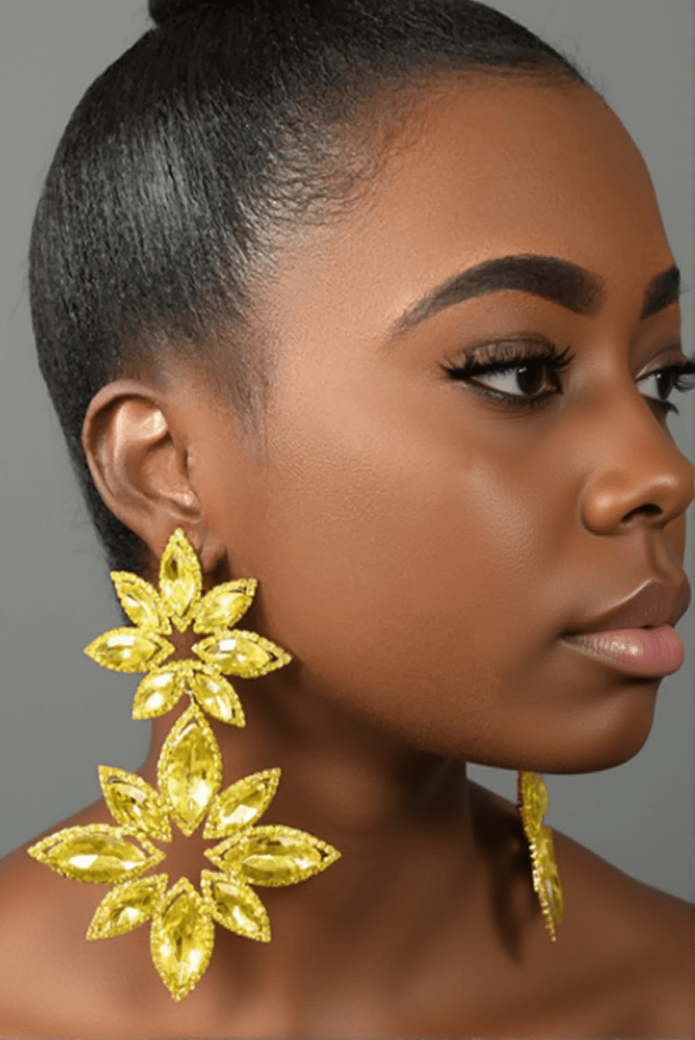 The Brittanie Flower Rhinestones Earrings look stunning on our model, beautifully complementing her formal attire. The perfect accessory for making a statement at any event.