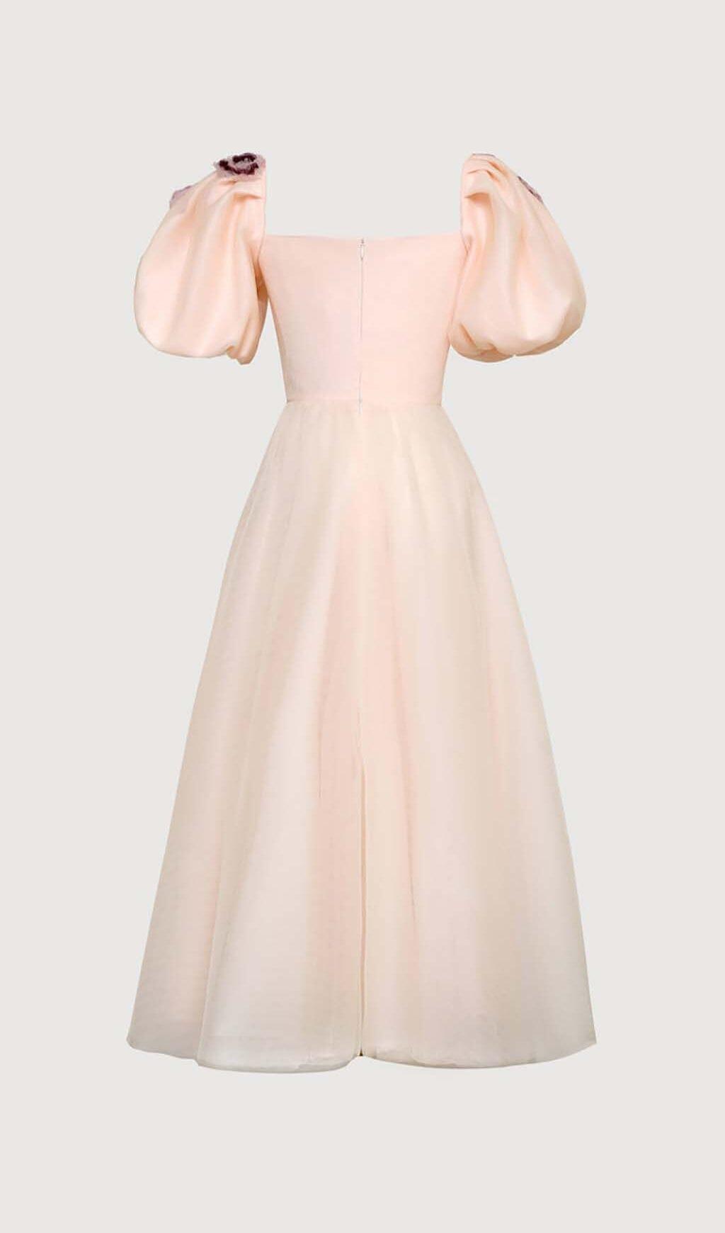 FLOWERS PRINT PUFF SLEEVE MIDI DRESS IN PINK