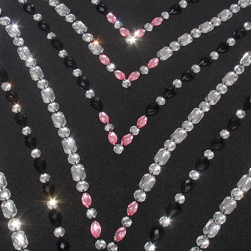 This bold and alluring dress features a unique patchwork design embellished with sparkling rhinestones, creating a statement-making look. The strapless, bodycon fit accentuates your curves, making you stand out from the crowd. Take on any event with confidence and style in this mini dress!