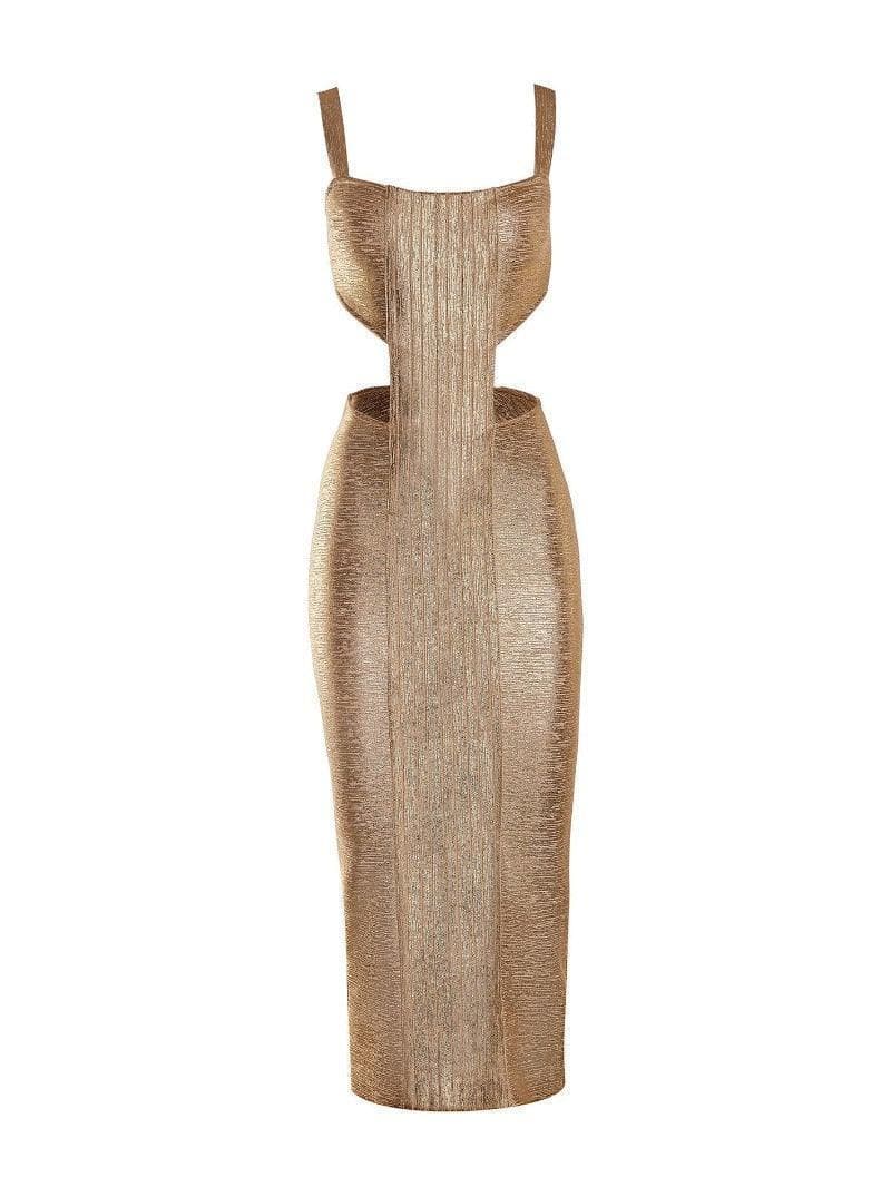 All eyes will be on you in the Freya Metallic Gold Dress. This bandage dress holds onto a sense of glamour with its metallic gold bandage fabric, open back, and classic square neckline. This maxi dress sculpts the figure's natural curves and opens up in the back for a sensual appeal.