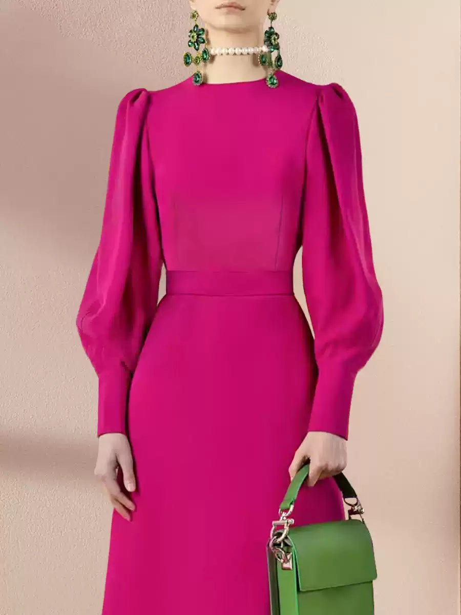 This dress in vivid fuchsia features puff sleeves, a round neckline, and a waist - defining band. The sleek midi silhouette exudes elegance. Perfect for ��celebrity event dress to impress�� moments, a ��holiday break dress to impress�� gathering, or a chic dinner. Its bold color and tailored design help you ��dress to impress�� with a modern, sophisticated charm, ideal for making a statement at special occasions.