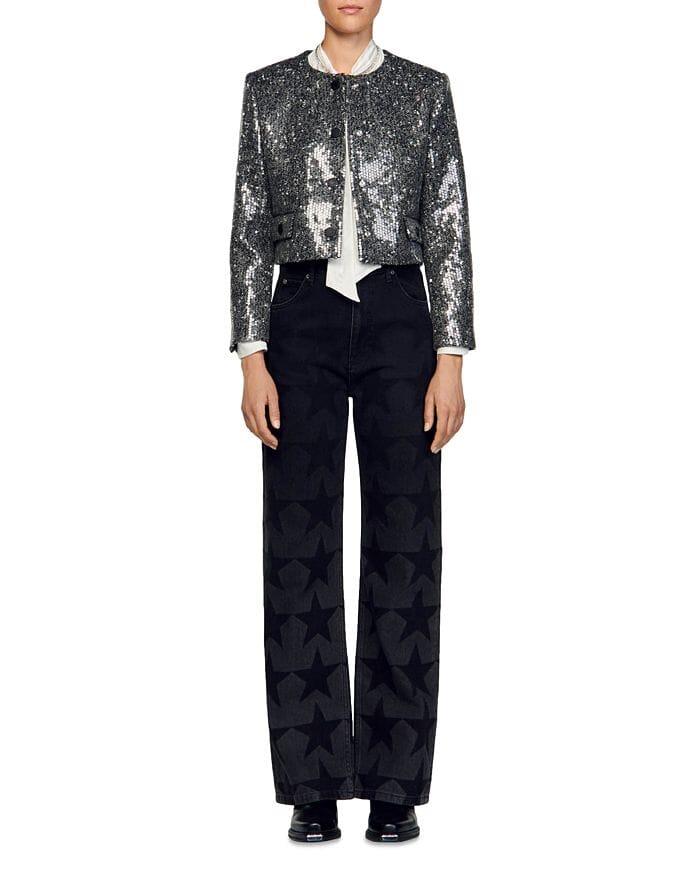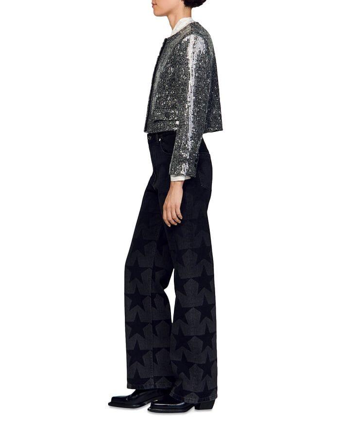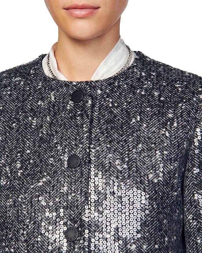 • Main: 64% polyester/34% wool/1% cotton/1% acrylic; lining: 100% viscose; yoke lining: 100% viscose; pocket lining: 100% cotton; sequins: 100% polyester