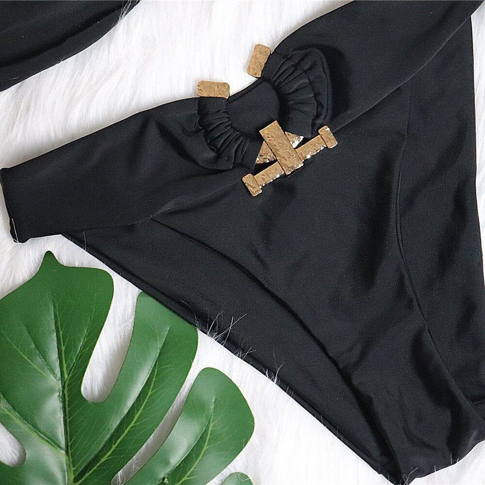 Elevate your beach or poolside style with our Gani Bikini in Black. Made from our premium stretch fabric, this bikini is designed to make you feel confident and comfortable all day long. With its attractive design top and metal trim, this bikini is perfect for a rooftop pool party or a day at the beach. Handcrafted with exquisite details, this bikini is sure to accentuate your curves and turn heads wherever you go.