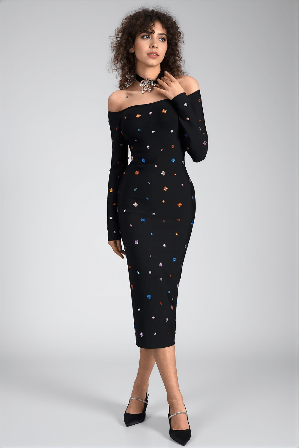 Ganide Crystal Long Sleeve Midi Dress