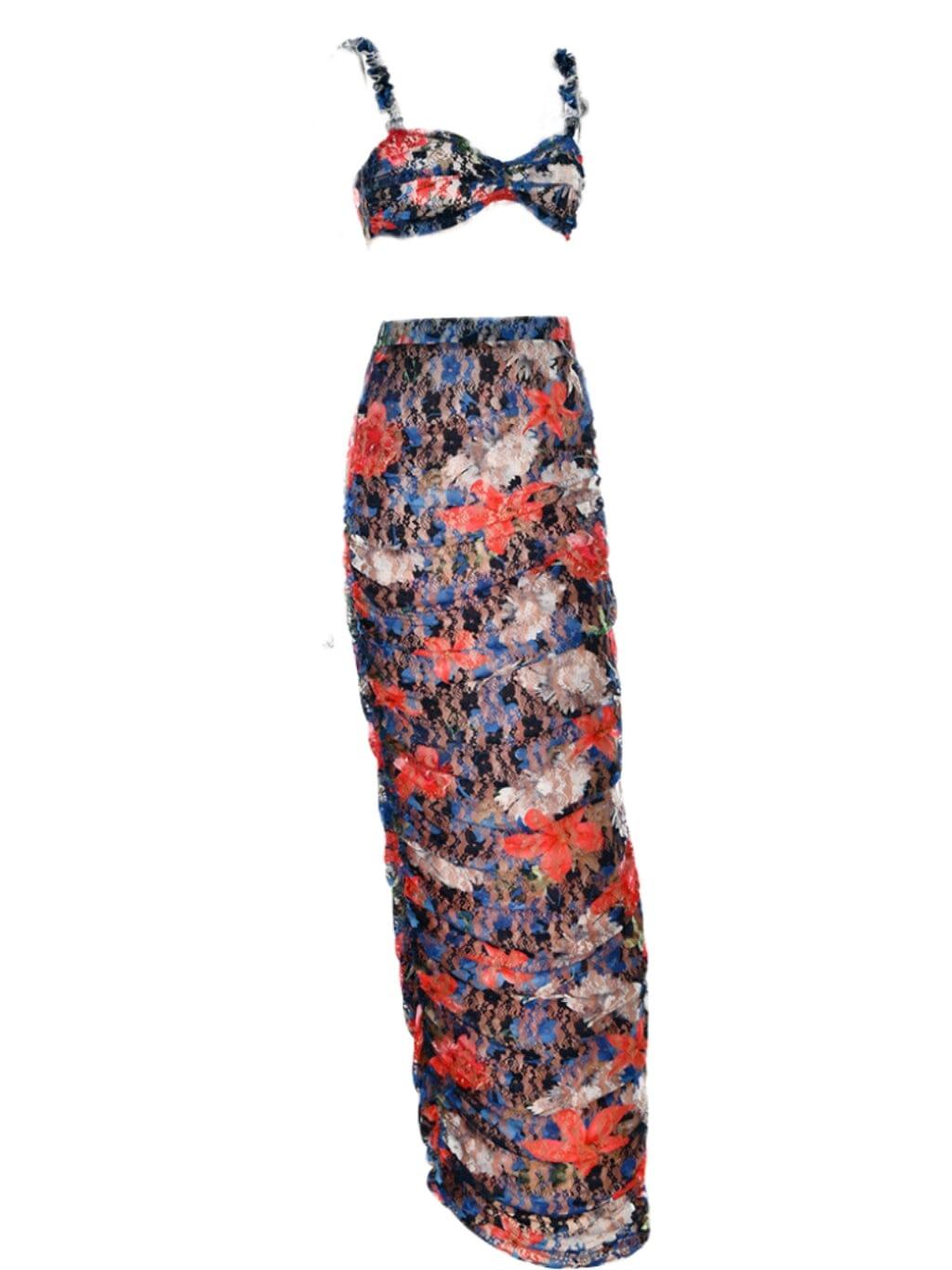Outshine the crowd in this glamorous Lace Plunge Skirt Set. Crafted from luxuriously soft lace, this two-piece ensemble features a beautiful V-neckline and a max-length skirt for a striking fit and look. Achieve a timelessly chic look with this beautiful skirt set.