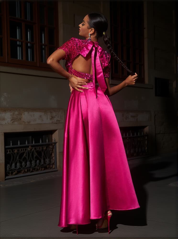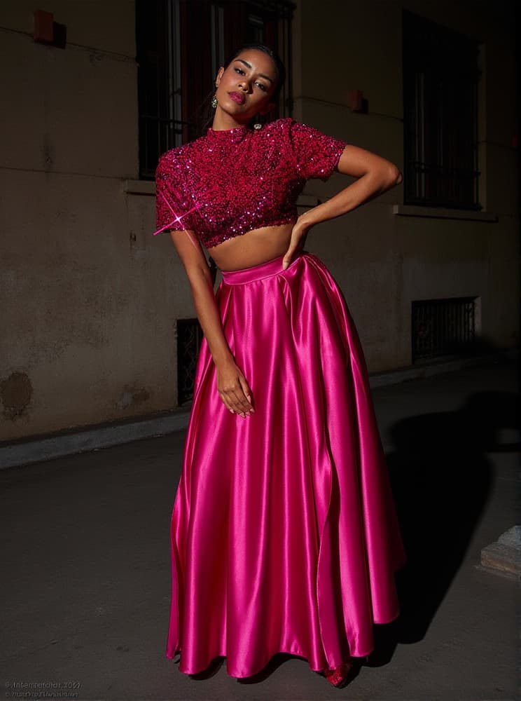 This Ginebra Split Skirt set includes a short sleeve top and a maxi skirt, both made from high-quality sequin and satin fabric. The skirt features a split for added elegance, making this set perfect for formal occasions. Create memorable looks with this stylish set.