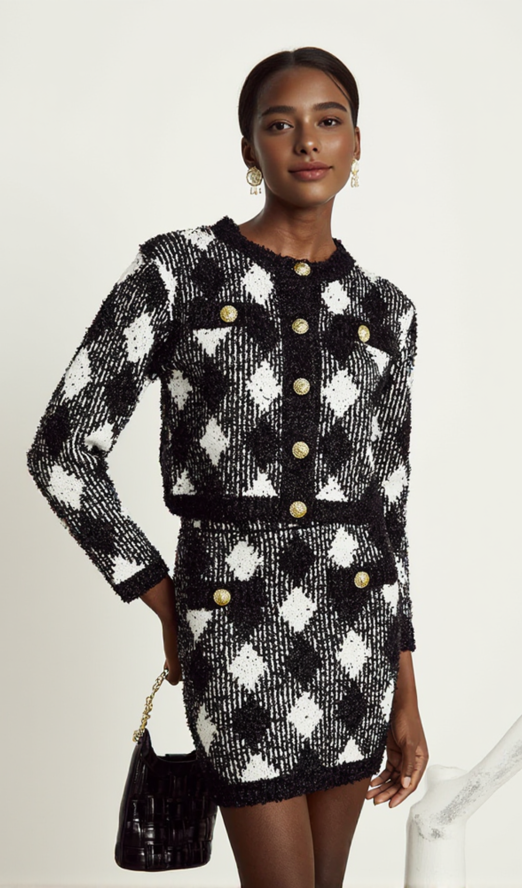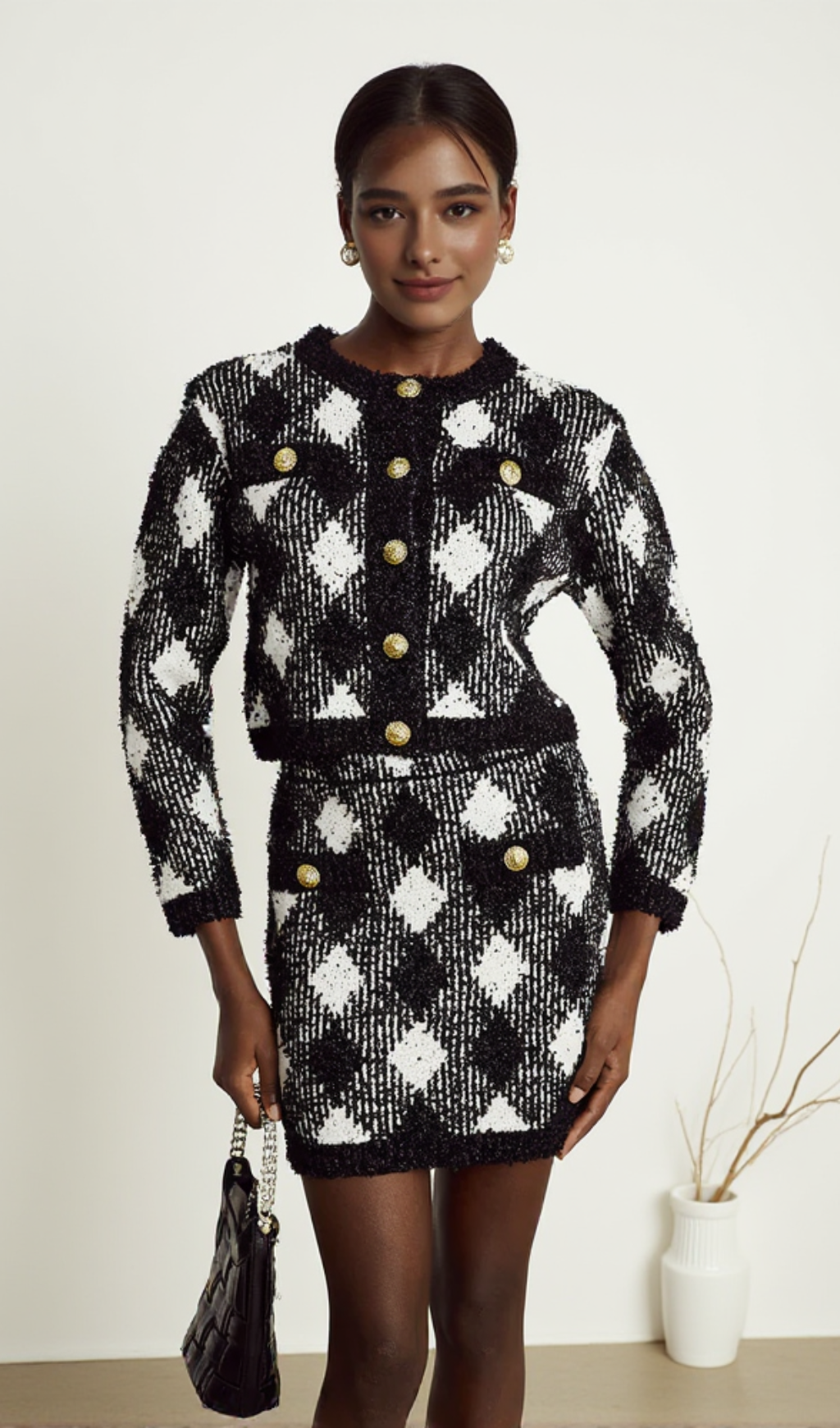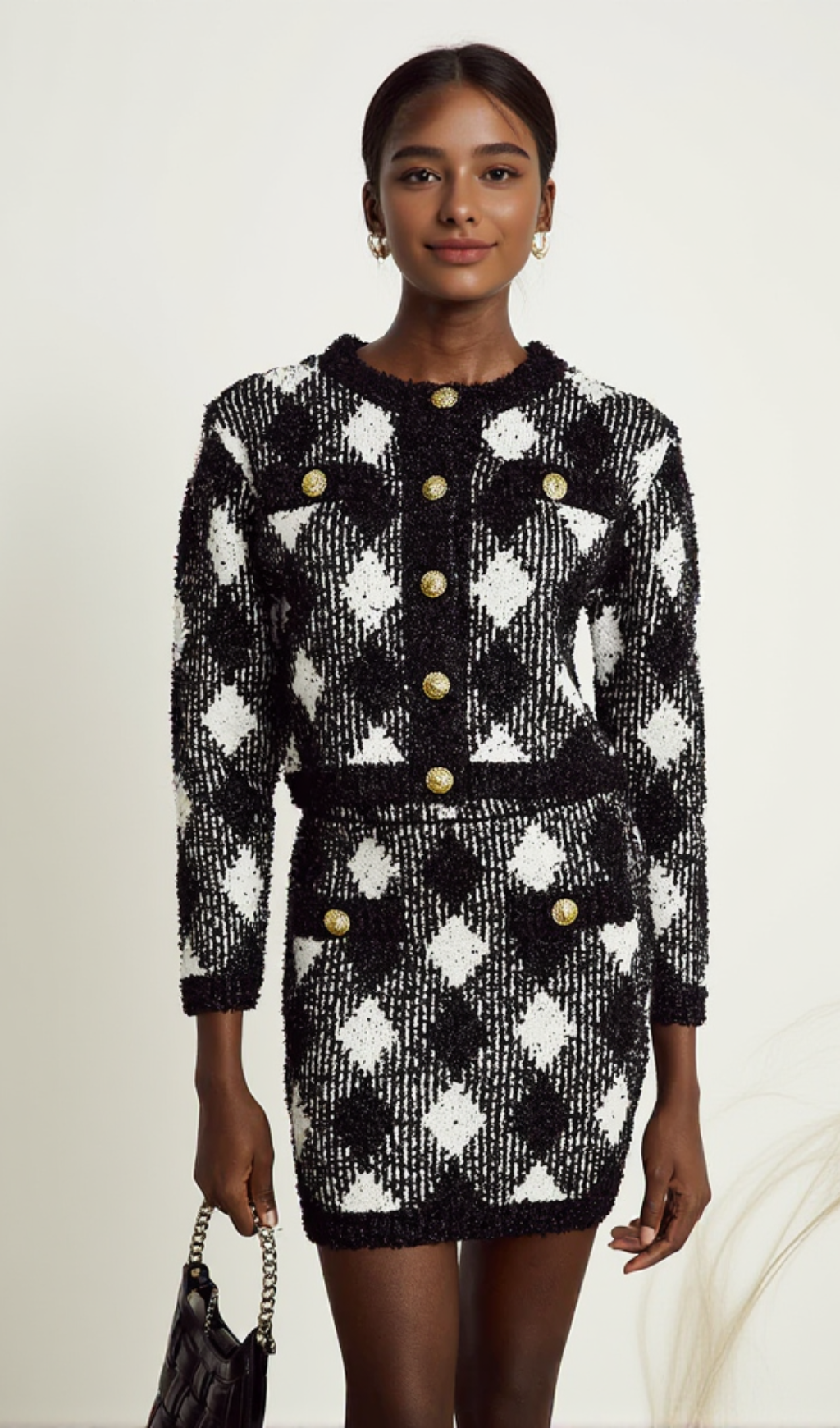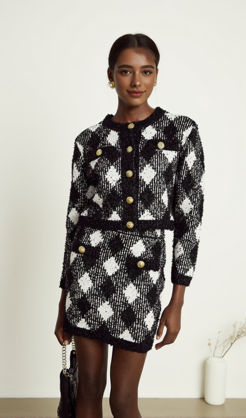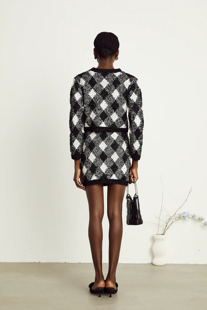 Introducing our gingham tweed mini skirt, a stylish addition to your wardrobe. Made with high-quality tweed, this skirt is both durable and comfortable. Its classic gingham pattern adds a touch of sophistication to any outfit. Perfect for any occasion, this mini skirt is a must-have for fashion-forward individuals.