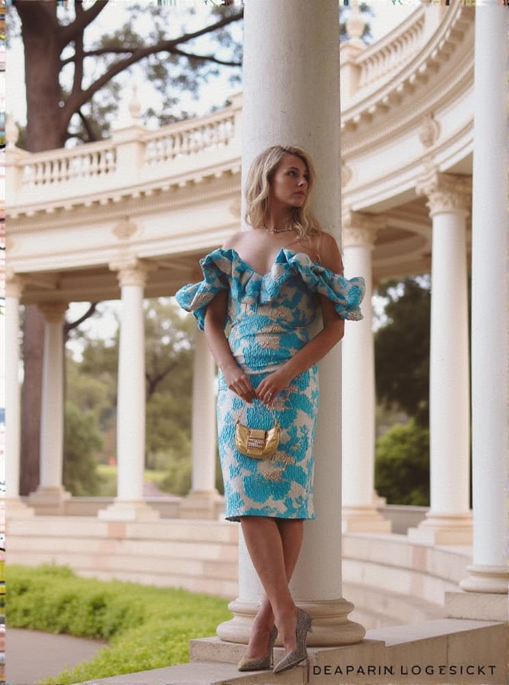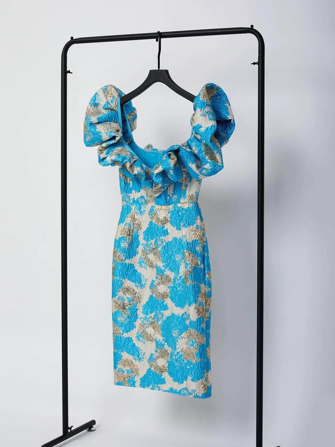 The Giselle Jacquard Off Shoulder Midi Dress designed in a vivid blue jacquard with gold embossing features a tight fitting mid-length silhouette with extravagant flounced ruffles along the plunging neckline and draped off the shoulders. Complete with satin lining and a centre back exposed metal zipper, this is the perfect style to draw attention at your next special event!