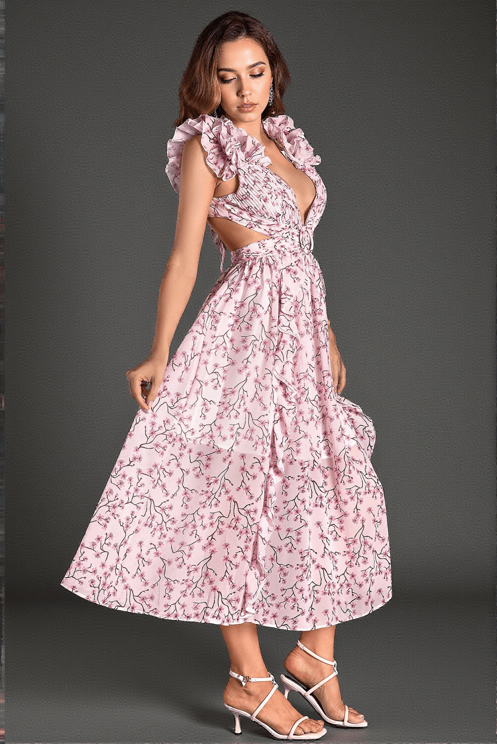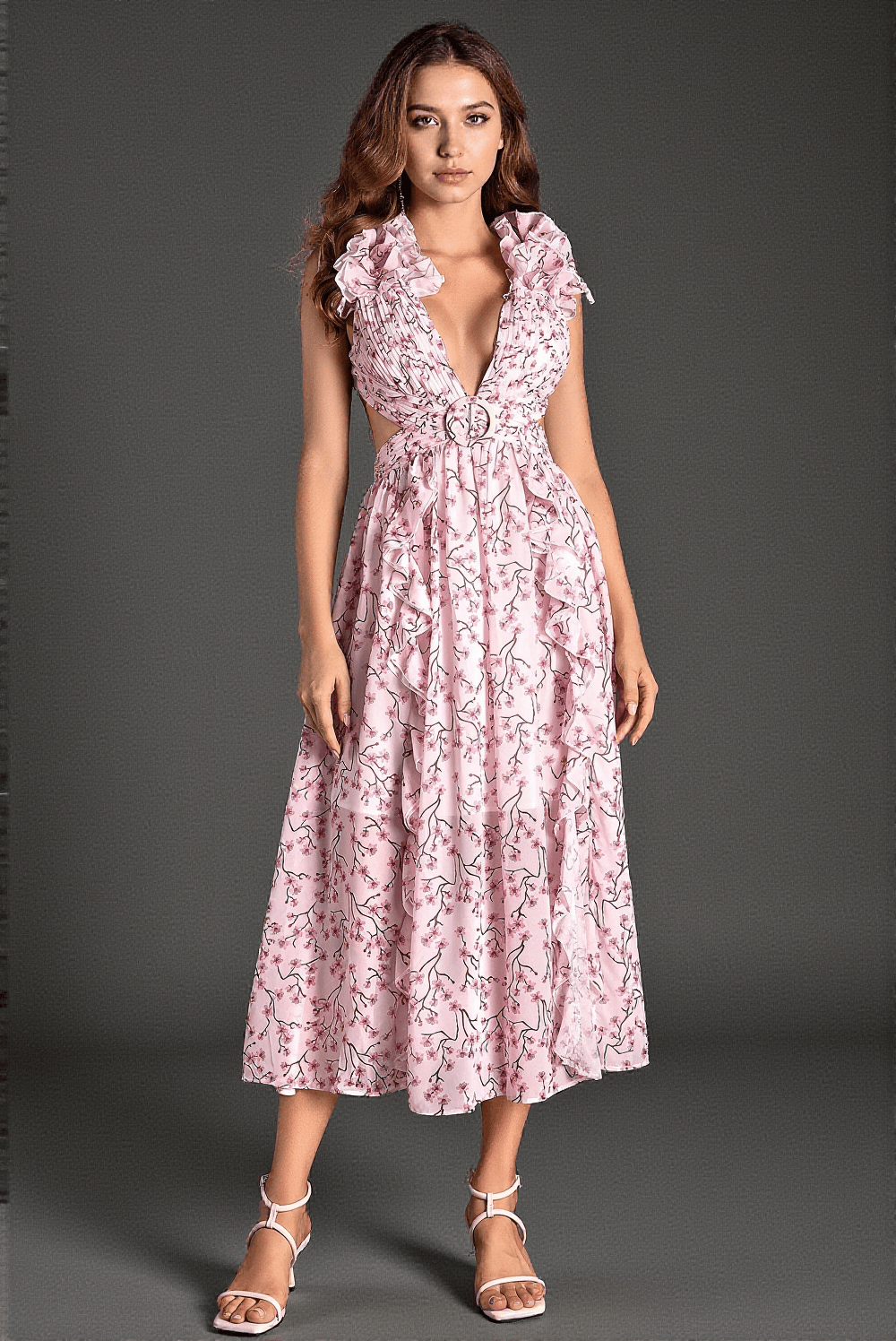 The Glaras Sleeveless V-Neck Floral Dress captivates with its intricate floral pattern, exuding elegance and charm at every glance. Designed to accentuate your natural grace and allure, this dress is perfect for garden parties, summer weddings, or any special occasion where you want to stand out.
