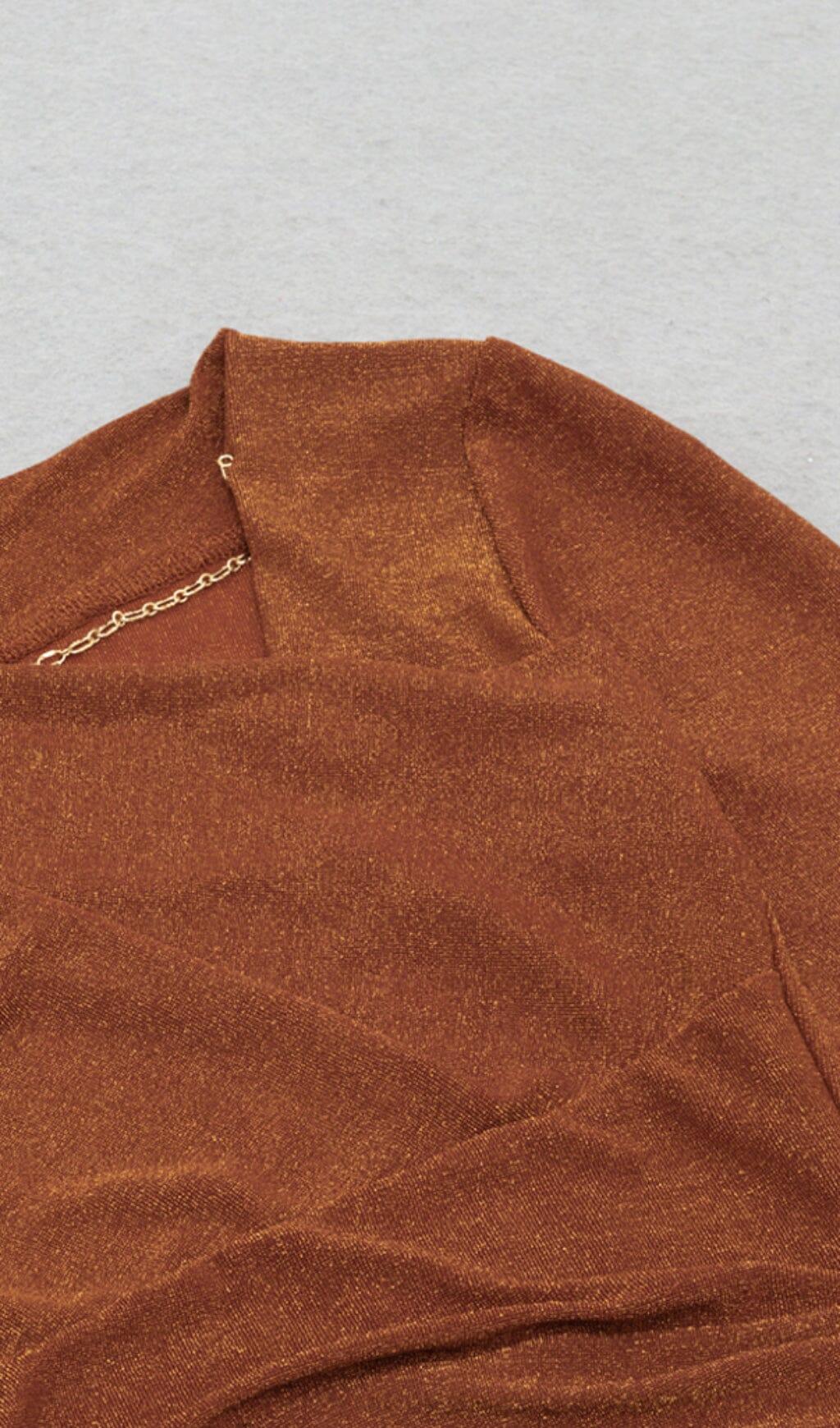 Introducing our GLIT Pleated Oblique Shoulder Dress in Brown, a truly remarkable piece that embodies elegance, sophistication, and showmanship. With its dark brown fabric and beautiful light gold sheen, this dress is designed to make you shine like a sunset on your body at dusk.
