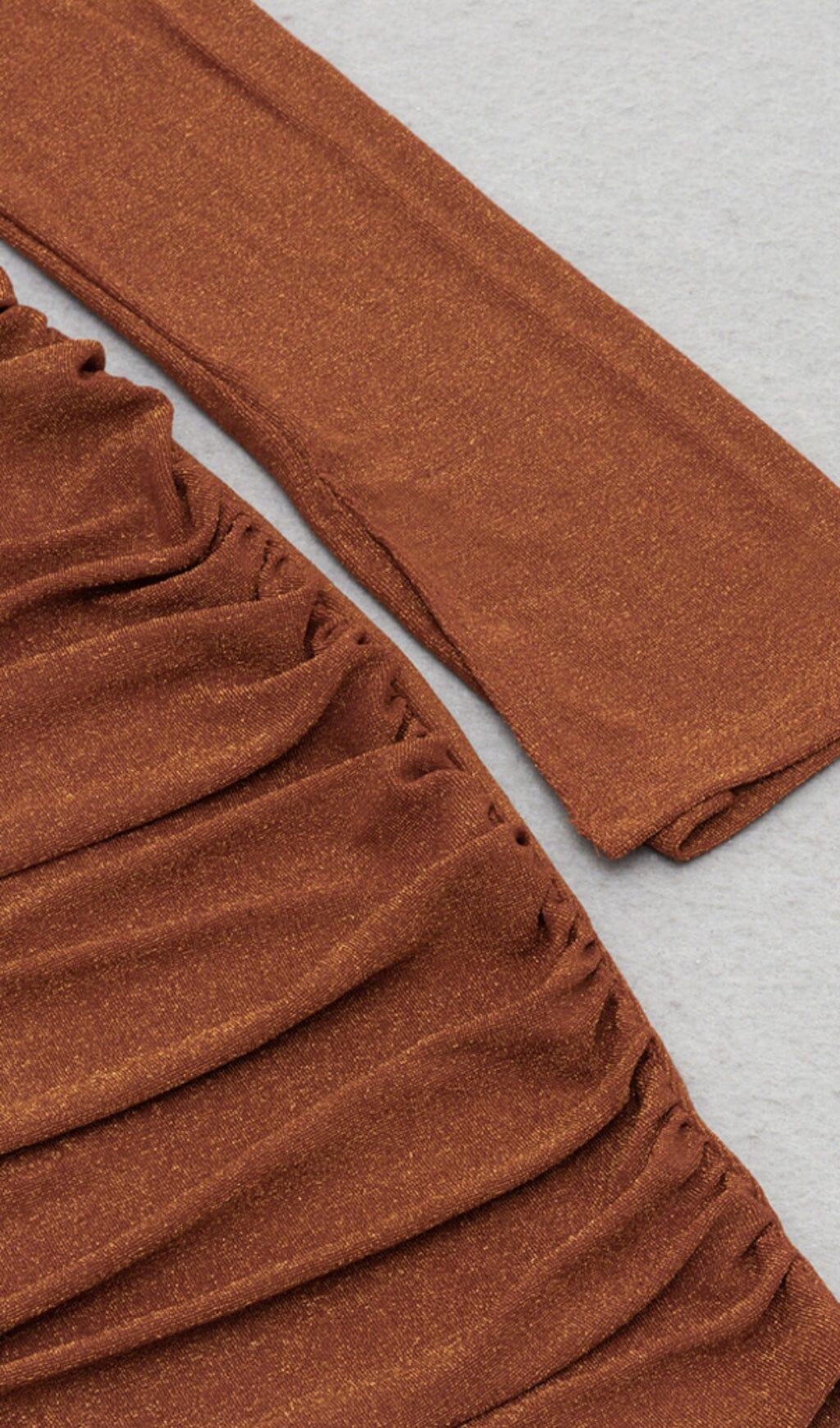 GLIT PLEATED OBLIQUE SHOULDER DRESS IN BROWN