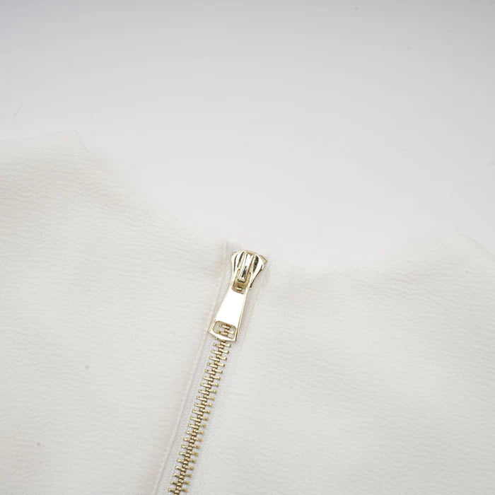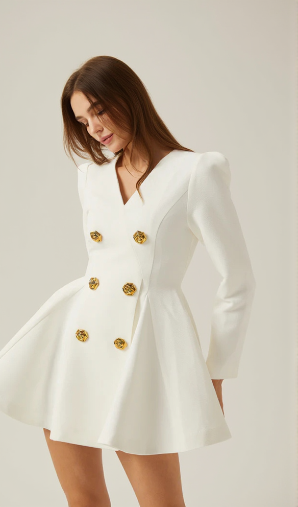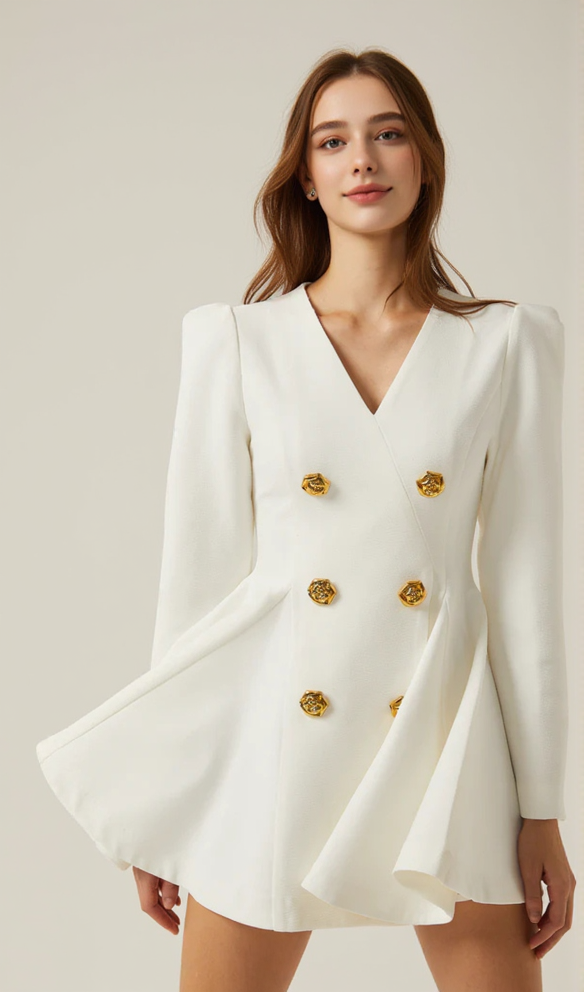 This sophisticated blazer dress features a gold-button detail, pleated peplum-hem, and crisp white hue. Perfect for work or special occasions, this dress oozes elegance and style. The unique design effortlessly combines classic and modern elements, making it a versatile and chic addition to any wardrobe.• V-neck