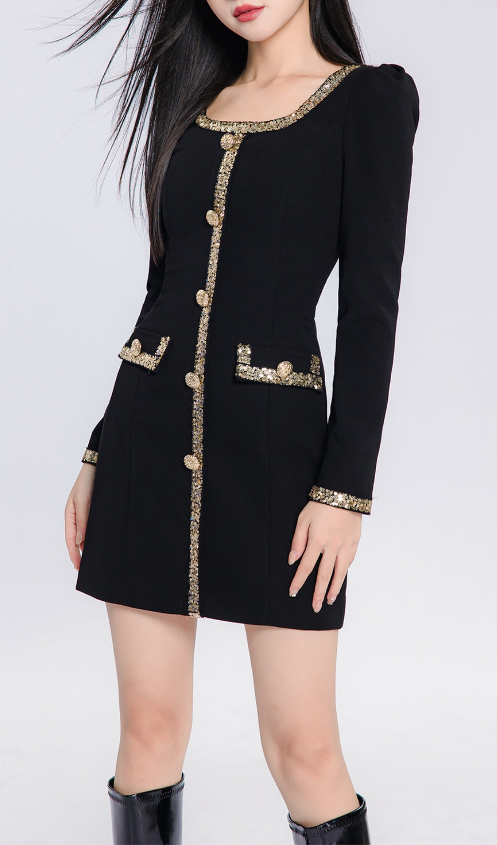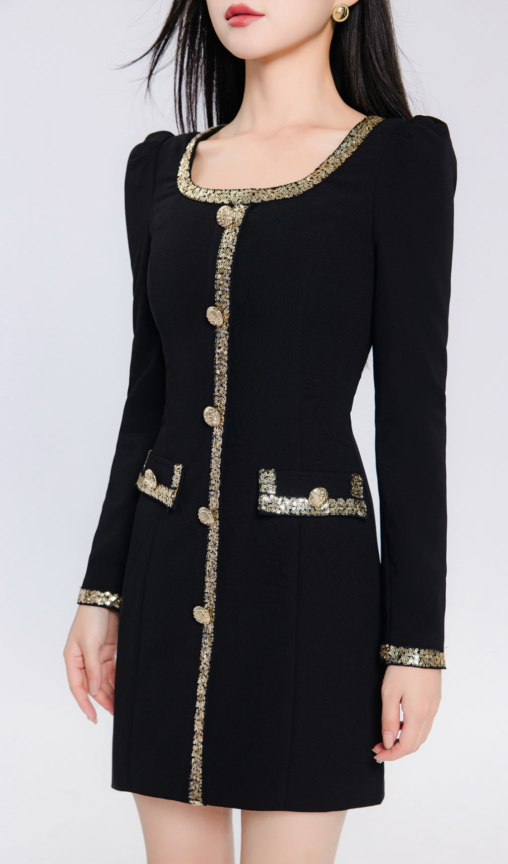 Look your best in this sophisticated and stylish mini dress! Featuring a square collar and long sleeves trimmed with glitzy gold, this unique little number gives off an air of glamour and class. Put it on and turn heads wherever you go!