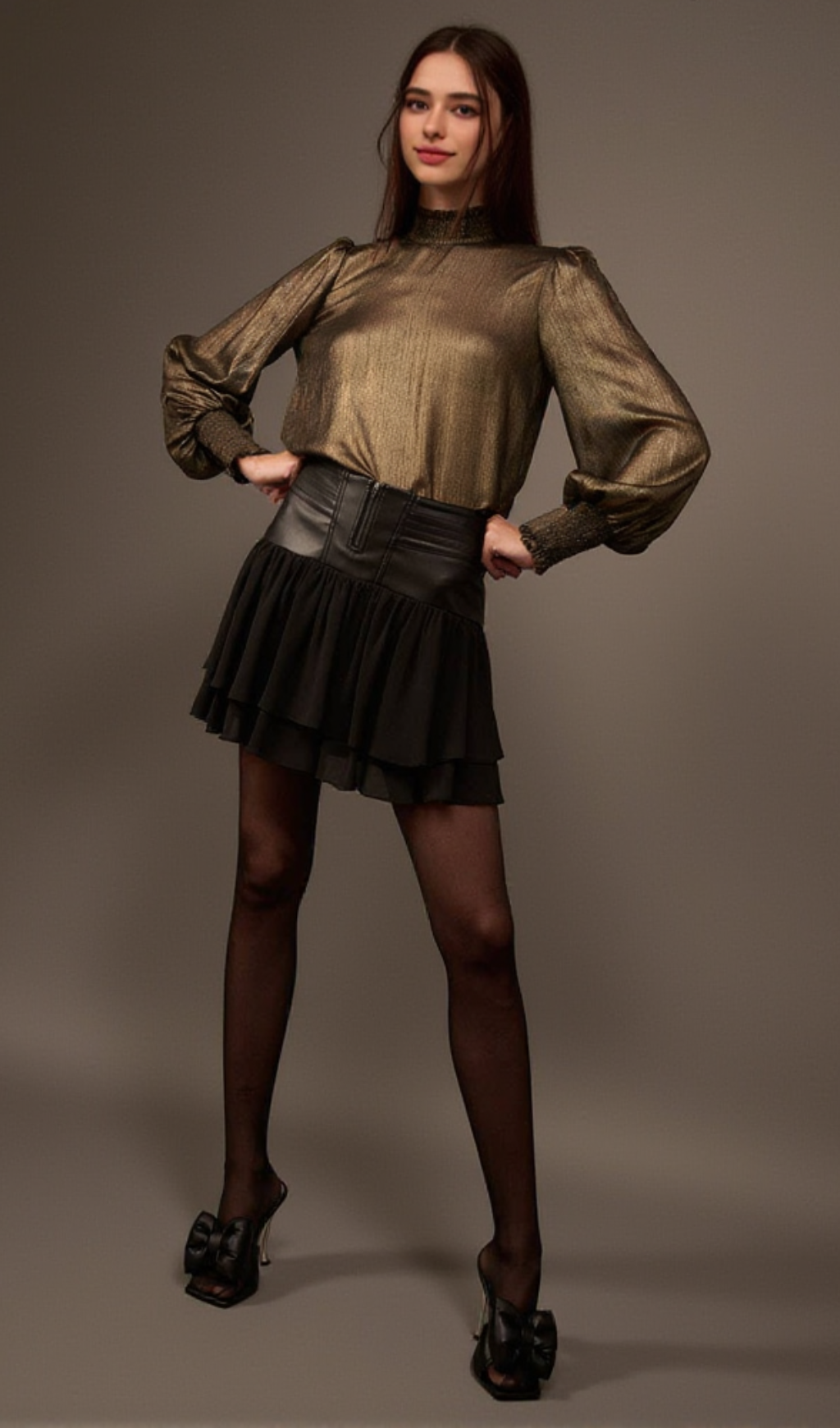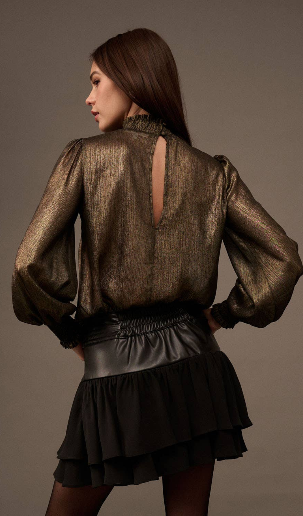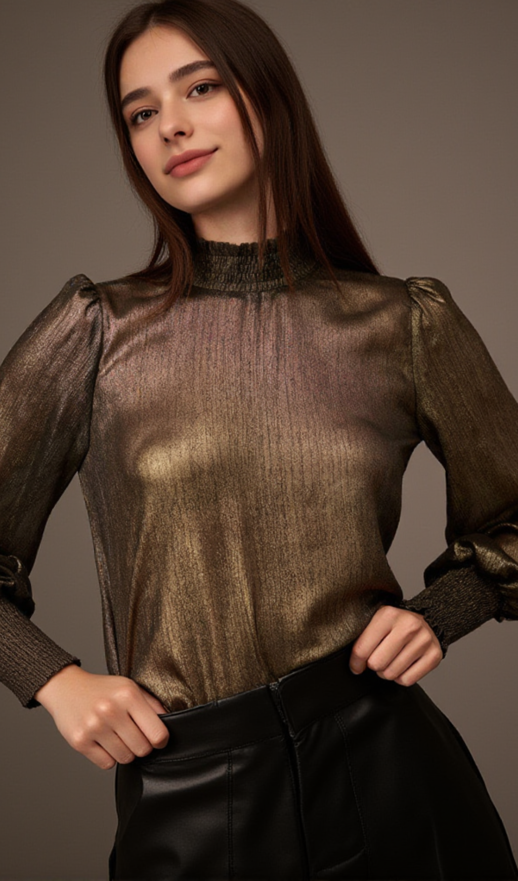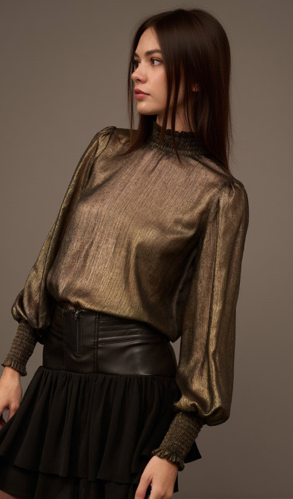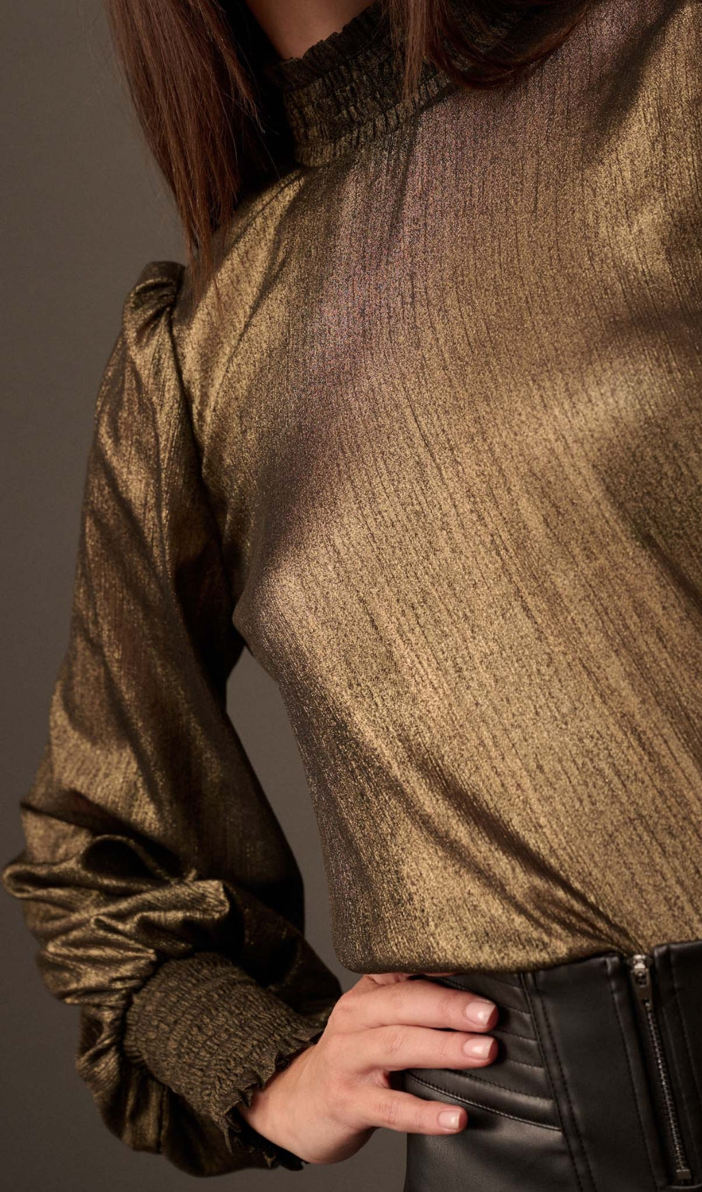 Add a touch of elegance to your wardrobe with our Golden Age Metallic Bishop-Sleeve Mock Neck Top. The mock neck and bishop sleeves give a stylish and sophisticated look, while the metallic fabric adds a touch of glamour. Perfect for both casual and formal occasions, this top is versatile and timeless.